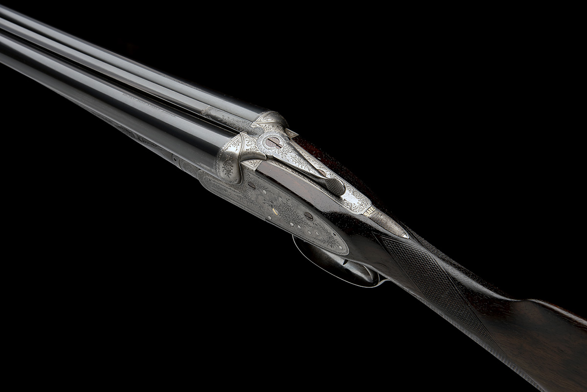 for 1919, 28in. nitro barrels, the tubes re-engraved 'HOLLAND & HOLLAND 98. NEW BOND STREET. LONDON.', 2 1/2in. chambers, bored approx. imp. cyl. and 1/4 choke, treble-grip action with removable striker discs, automatic safety with gold-inlaid 'SAFE' detail, gold-inlaid cocking-indicators, fine border and acanthus scroll engraving, retaining very slight traces of original colour-hardening, 14 3/4in. stock, weight 6lb. 11oz., in its leather case