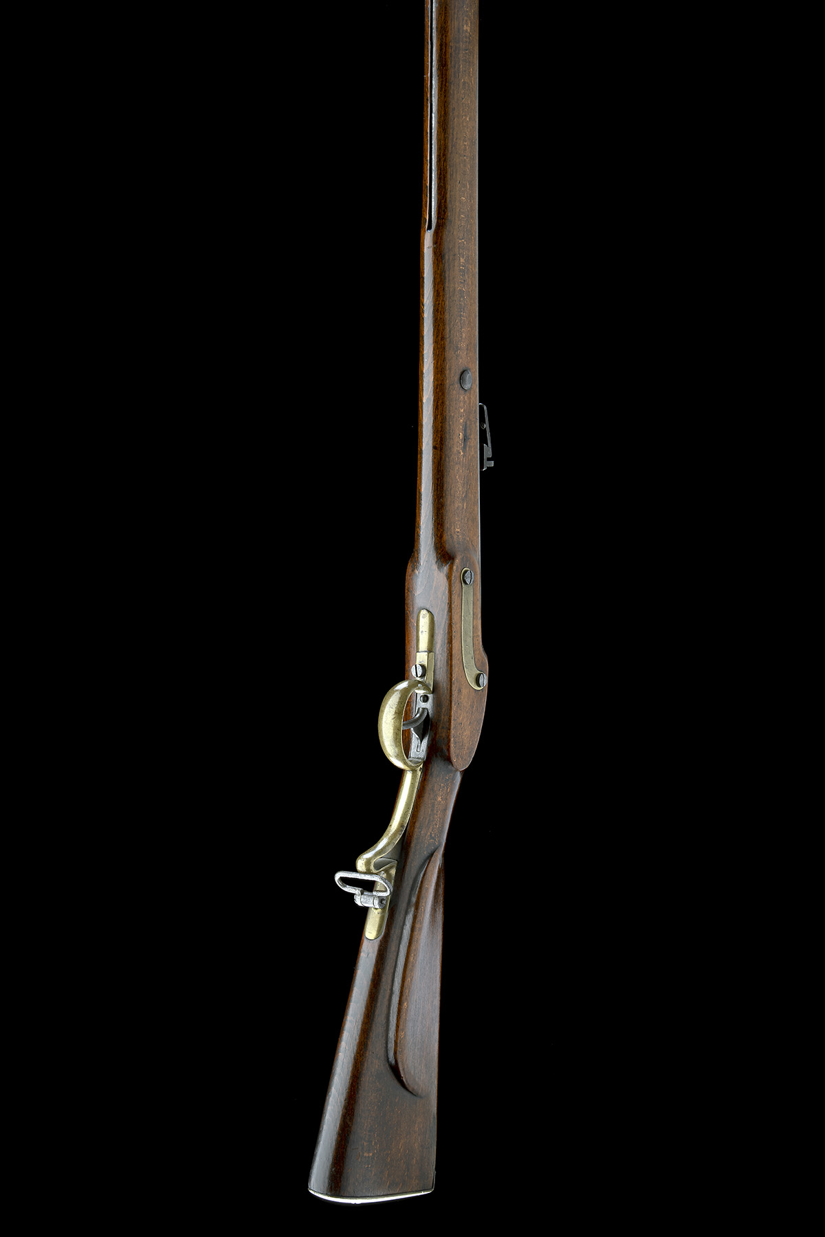 A .730 PERCUSSION SERVICE-RIFLE SIGNED BERD FRUWIRTH, MODEL 'LORENZ' RIFLE, no visible serial number, circa 1861, possibly converted from flintlock, with octagonal to round iron 33 1/4in. rifled barrel signed 'BERD. FRUWIRTH' and marked '2C' over '17', applied blade fore-sight, dove-tailed folding rear-sight at breech-end, plain bevel-edged lock, walnut three-quarter stock with heavy iron furniture, raised cheek-piece, cup-ended iron ramrod, some cleaning and mild staining