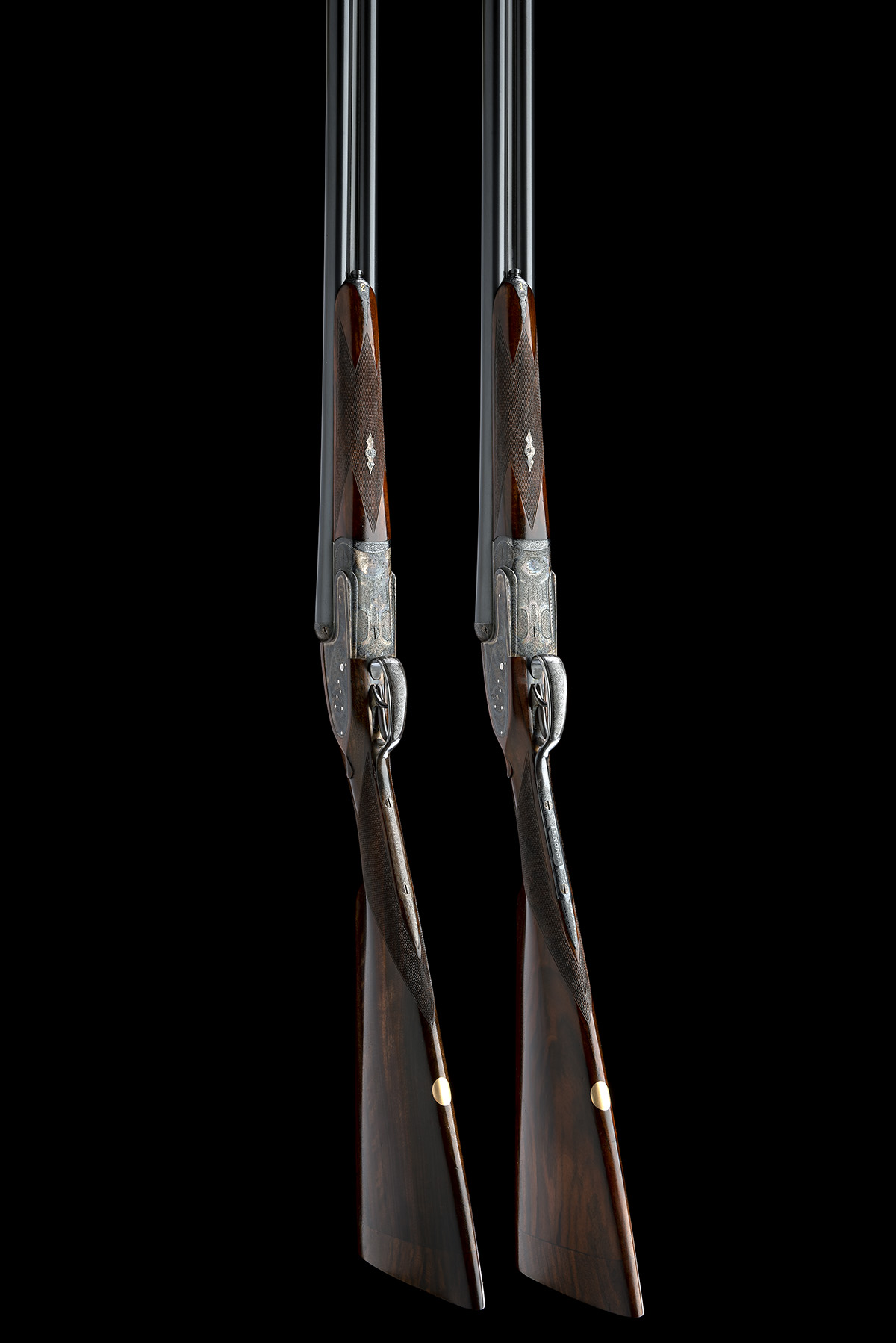 for 1982, 28in. nitro chopperlump barrels (No.1 reproved in 2022), 2 3/4in. chambers, bored approx. imp. cyl. and 1/4 choke, toplevers gold-inlaid '1' and '2', removable striker discs, automatic safeties with gold-inlaid 'SAFE' details, hand-detachable lockplates, gold-inlaid cocking-indicators, articulated front triggers, rolled-edge triggerguards, fine acanthus scroll engraving with floral bouquets, retaining much original colour-hardening and finish, 15 5/8in. figured stocks including 1 1/8in. wooden extensions, No.1 with crack to left underhorn, weight 6lb. 11oz.
