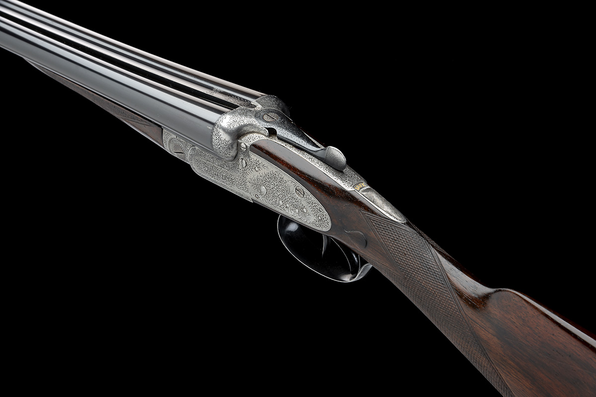 circa 1897, 25 1/2in. replacement nitro barrels, 2 1/2in. chambers, bored approx. true cyl. and 1/2 choke, treble-grip action, automatic safety with gold-inlaid 'SAFE' detail, beaded border and acanthus scroll engraving, brushed bright finish, 14 1/4in. stock (cast on for a left-hander) including buttplate, weight 5lb. 11oz.