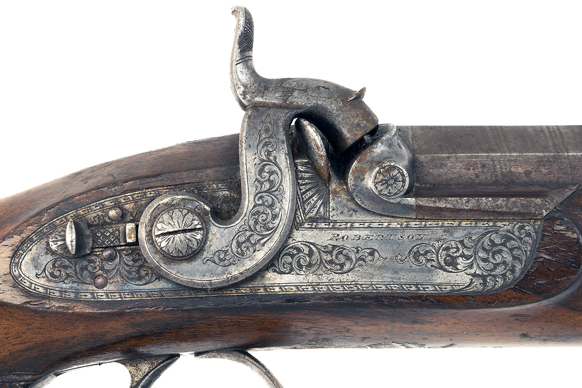 circa 1840, with browned octagonal 13in. barrels (one rifled, one smooth), the top-flats signed 'HADDINGTON', white metal fore-sights, colour hardened breech-blocks, fully engraved top-tang with standing notch rear-sight, border and scroll engraved colour-hardened bar-action lock signed 'ROBERTSON', engraved hammer with sliding safe behind, walnut half-stock with chequered bag-shaped butt, the back of grip with escutcheoned square socket to accept the detachable walnut butt-stock, blued spurred trigger guard bow, brass-tipped ramrod and complete in its original mahogany case compartmented and lined in green baize and including a three-way flask, breech-brush, nipple-key, wad-punch, bone nipple-pot and scissors ball-mould