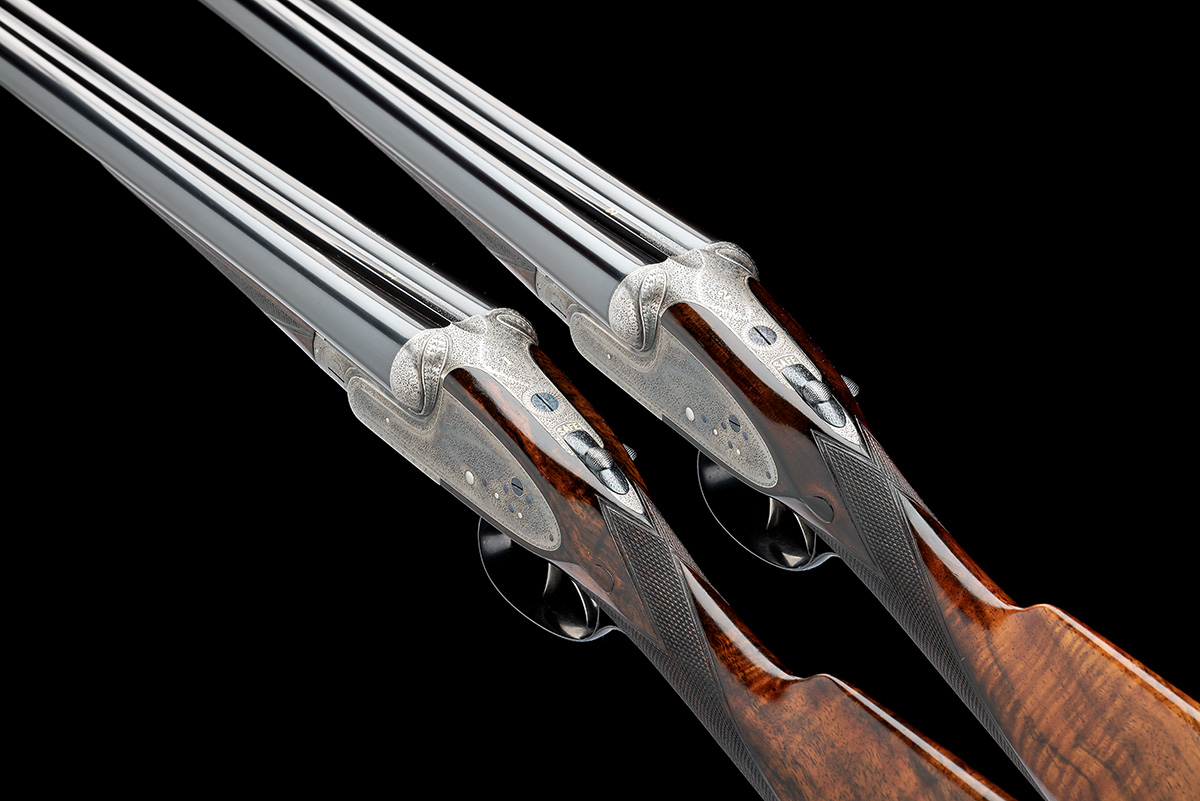 for 1930, 28in. nitro chopperlump barrels, the ribs gold-inlaid '1' and '2' at the breech ends, the tubes engraved 'STEPHEN GRANT & SONS. 7, BURY STREET. ST. JAMES'S. LONDON.' (rubbed), 2 1/2in. chambers, bored approx. imp. cyl. and 1/2 choke, sidelever actions with removable striker discs, carved fluted fences and gold-inlaid '1' and '2', automatic safeties with gold-inlaid 'SAFE' details, best fine acanthus scroll engraving, retaining traces of colour-hardening and renewed finish, 15 3/8in. well-figured stocks including 1 1/2in. wooden extensions, very minor crack at hand No.2, weight 6lb. 9oz. (No.1) and 6lb. 8oz. (No.2), in their lightweight leather motor case
