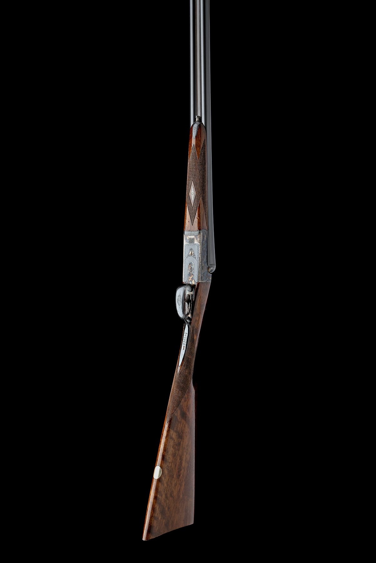 for 1981, 27in. nitro chopperlump barrels, 2 3/4in. chambers, bored approx. 1/4 and 1/2 choke, removable striker discs, automatic safety with gold-inlaid 'S' detail, border and partial acanthus scroll engraving, retaining much original colour-hardening and finish, 14 1/2in. stock, weight 5lb. 12oz.