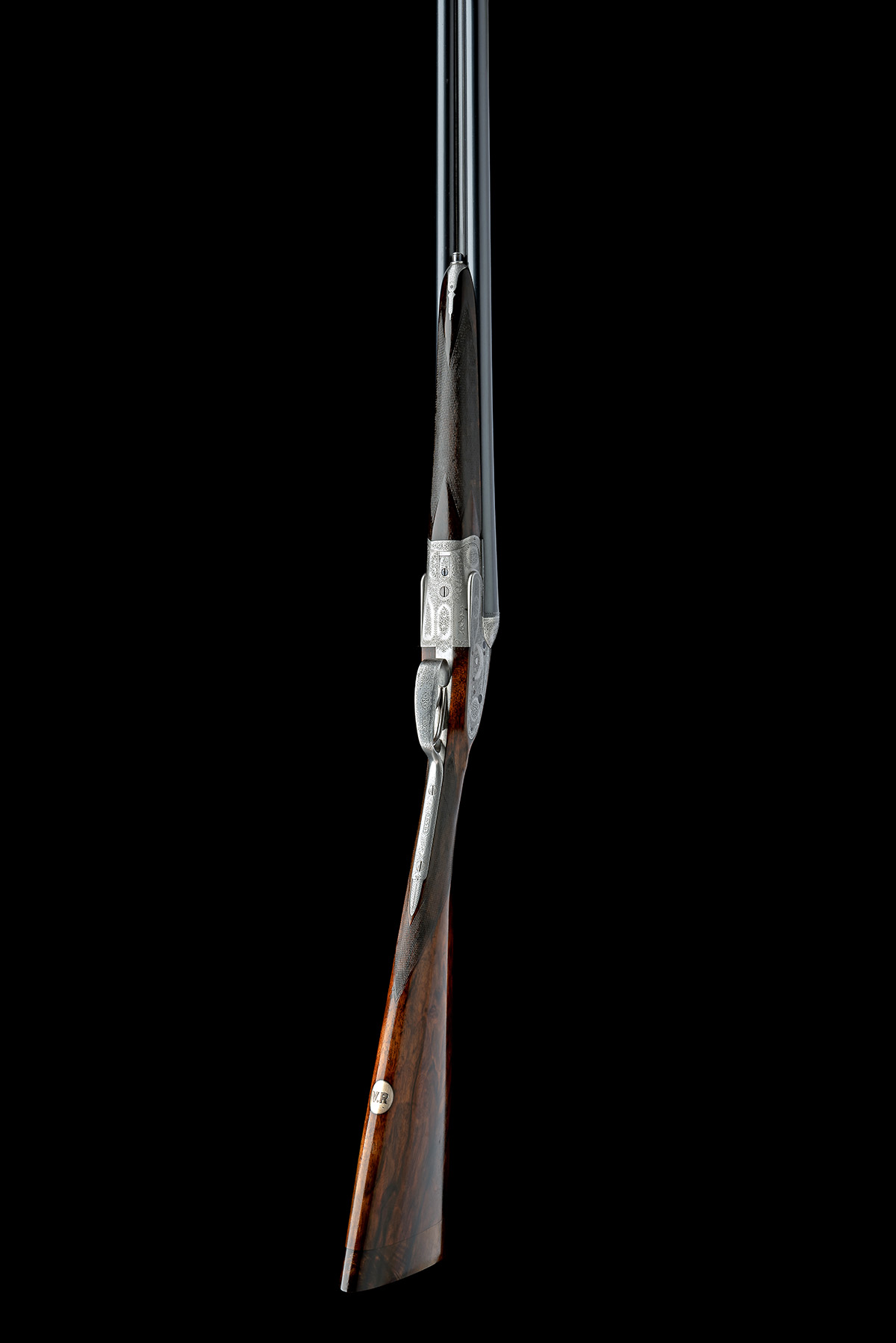 circa 1900, 27in. nitro replacement barrels (in 1964), the rib engraved 'NEW BARRELS. BY B.E. CHAPLIN. WINCHESTER.', and with acanthus scroll detailing at the breech end, 2 1/2in. chambers, bored approx. 1/4 and 1/2 choke, treble-grip action with conical fences and removable striker discs, slender toplever, automatic safety with gold-inlaid 'SAFE' detail, border, acanthus scroll and floral bouquet engraving, bright finish with reblued pins, 15in. figured stock including 1 1/8in. wooden extension, weight 5lb. 14oz.