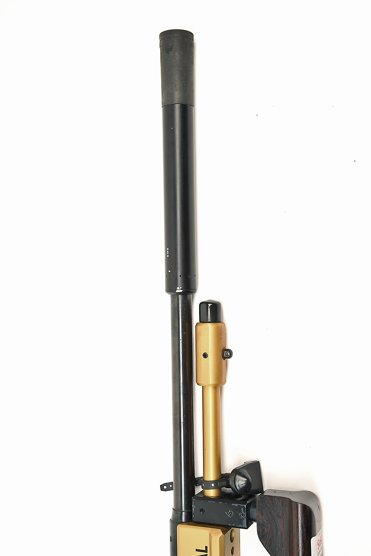 J.G ANSCHUTZ .22 L.R. 'MODELL MATCH 54 - TERRY MANN SYSTEM 2000 MATCH SPECIAL' BOLT-ACTION SINGLE-SHOT CUSTOM TARGET RIFLE, serial no. 146506X for 1977, 13 1/2in. unsighted nitro reproved barrel with sound moderator, receiver with integral sight rail, manual safety, enlarged ball bolt handle, adjustable trigger, custom aluminium fully adjustable chassis with front weight, walnut hand grip, pistolgrip, walnut comb, gripped butt, applied decals of 'TERRY MANN. SYSTEM 2000. MATCH SPECIAL.', gold and blued finish, weight 10lb. 2oz. + sound moderator