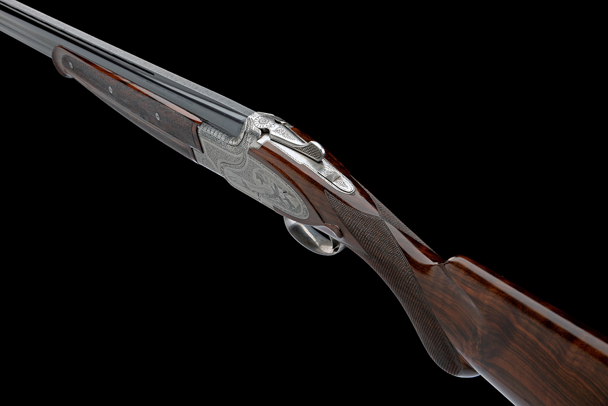 for 1965, 30in. nitro barrels with 7mm ventilated matt top-rib, 2 3/4in. chambers, bored approx. 1/4 and 3/4 choke, three-piece fore-end, hold-open toplever, automatic safety with integral barrel selector switch, gold-inlaid with 'O', 'U' and 'S' details, fine acanthus scroll engraving with beaded bordering and finely engraved game scenes of pheasant and English partridge, the underside with a bolting hare, the triggerplate signed 'GIRONI', bright finish, 14 5/8in. highly-figured pistolgrip stock (cast on for the left shoulder), weight 7lb. 14oz., in a Browning universal case