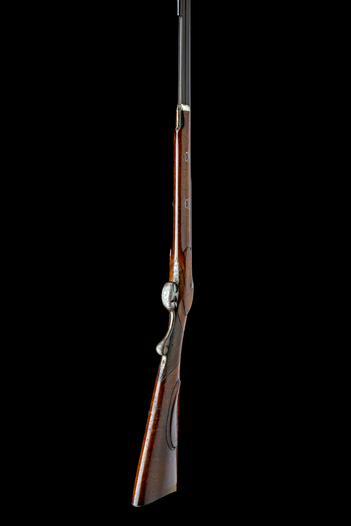 circa 1805 with later conversion to percussion from flint, with octagonal to sixteen-sided to round 32in. barrel, a gold poincon inlaid at breech marked 'I.G. LACY, LONDON' and the top-flat addressed '6 ROYAL EXCHANGE LONDON', applied white metal bead fore-sight, gold line at breech, engraved top-tang, carved and moulded drum for the nipple, borderline and florally engraved lock (cleaned), the original pan cut away for the drum, engraved and moulded dolphin-mouthed hammer, walnut half-stock chequered at the wrist, raised cheek-piece, iron furniture including two barrel-keys and under-barrel rib for ramrod (ramrod absent)