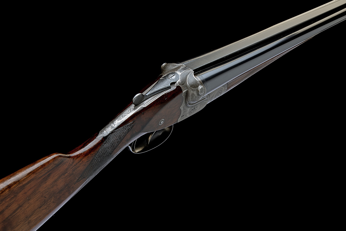 circa 1910, 29 7/8in. sleeved nitro reproved barrels (in 2025), with raised tapered solid matt rib, 3in. chambers, bored approx. full choke in both, bolstered scroll-back treble grip action with carved serpentine fences, the standing breech engraved '4164', manual side safety with engraved 'S' detail, border and acanthus scroll engraving, retaining very slight traces of original colour-hardening and finish, 13 7/8in. figured stock with diamond shaped horn-inlaid drop points, extra long fore-end with Deeley & Edge release catch and horn finial, weight 8lb. 1oz., in a brass cornered oak and leather single guncase