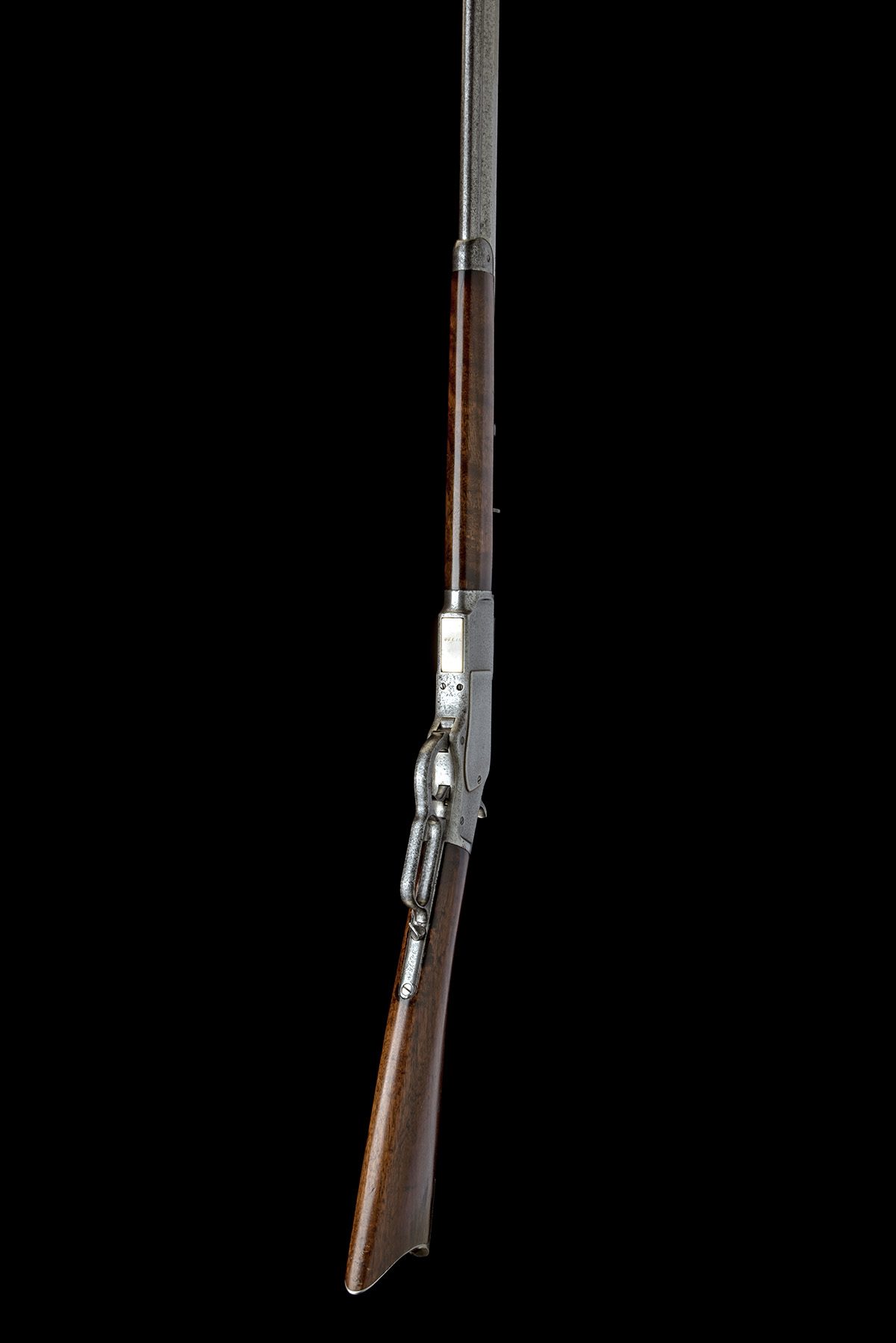 for 1890, with octagonal 24 1/4in. barrel, dove-tailed blade fore-sight, elevating buck-horn rear-sight, the top-flat of barrel signed 'WINCHESTER'S REPEATING ARMS NEW HAVEN CONN. U.S.A.' and with the usual 1866 and 1860 patent dates, calibre marking at breech, sideplated slab-sided receiver with sliding dust-cover and brass cartridge lifter, exposed hammer, the top-tang marked 'MODEL 1873', walnut butt-stock with crescent heel-plate with central trap, walnut fore-end and full-length magazine, lightly cleaned of finish, with a certificate of proof and a letter stating the rifle was recovered during the Gallipoli Campaign