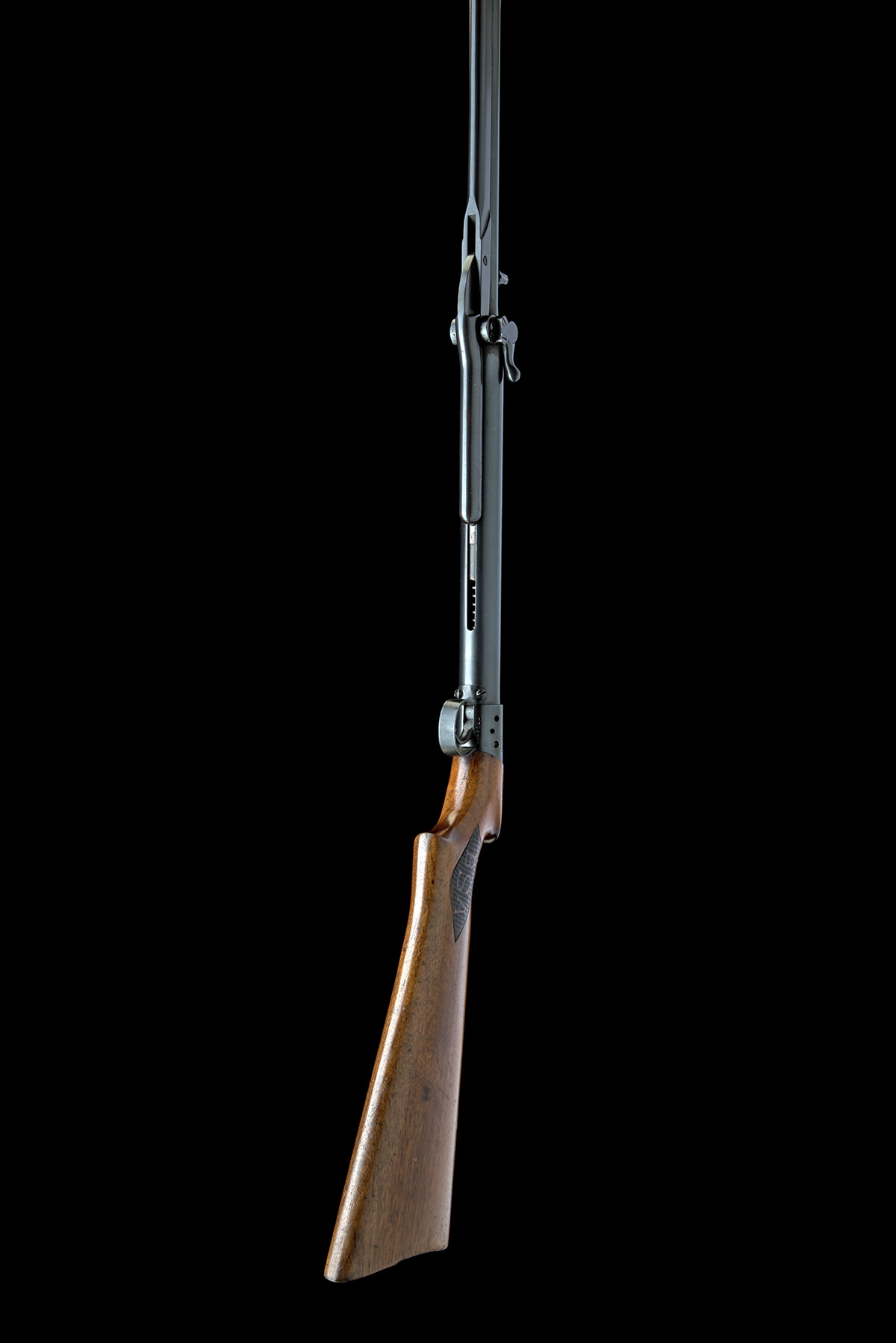 one of the last produced in 1939, with reblued 19 1/4in. barrel, dove-tailed fore-sight, elevating notch rear-sight, tap-action breech, reblued air chamber (no etched details remaining), three-hole trigger unit, walnut saw-handled butt-stock and push-button release under-lever