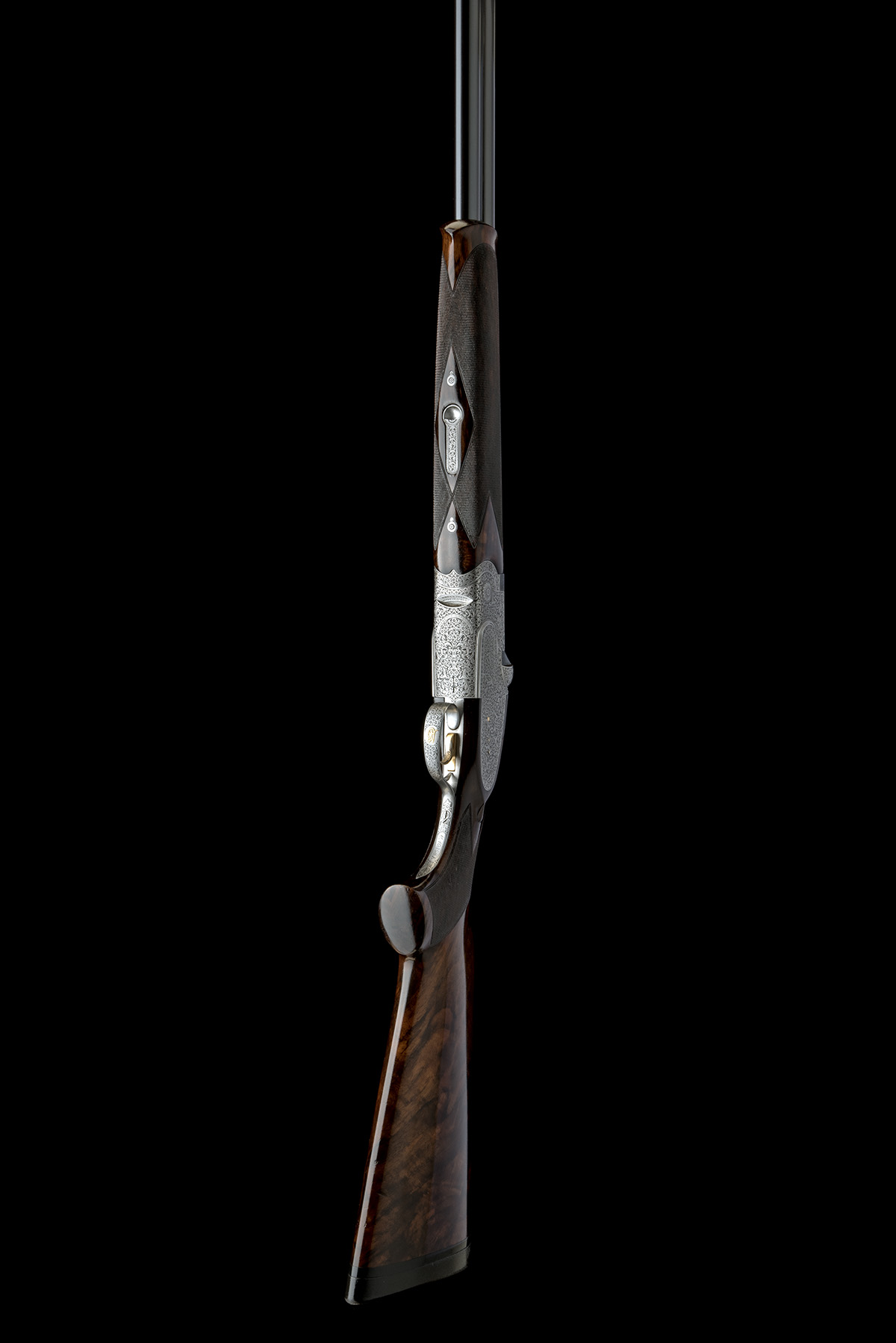 pierced hold-open toplever gold-inlaid with a hexagram, manual safety with gold-inlaid 'S' detail and integral barrel selector switch, gold-washed single trigger, profusely engraved with floral scrollwork, silver finish, 14 1/4in. figured pistolgrip stock including 3/4in. rubber recoil pad, weight 7lb. 10oz., in its makers canvas and leather case with provision for both sets of barrels