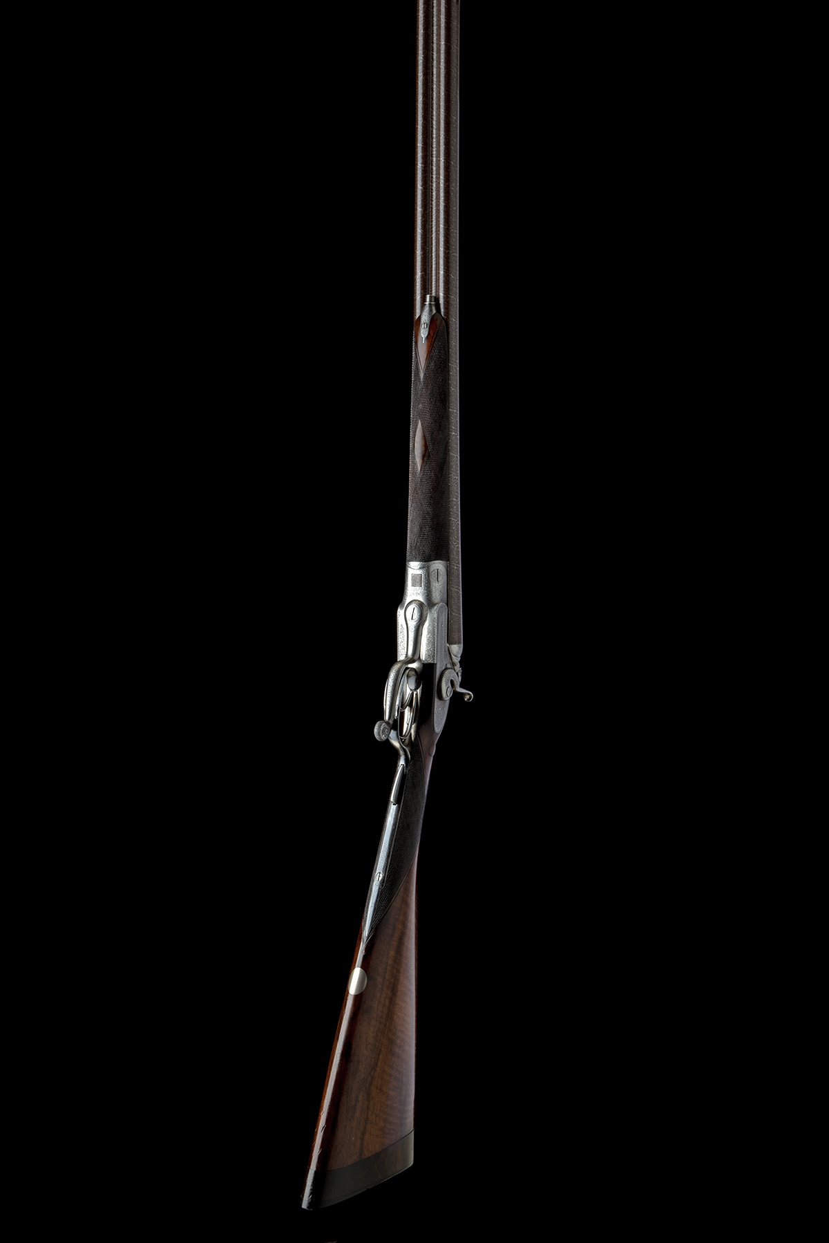 serial number on under-rib only (forward of loop), circa 1880, 32in. nitro reproved bold damascus barrels (in 1972), rib inscription rubbed, 2 3/4in. chambers, bored approx. 1/2 choke in both, wall thicknesses at 13 and 19, some minor pits and dents, Jones patent rotary-underlever, carved percussion fences with button-head strikers, rebounding sidelocks, grip safety, fine acanthus scroll engraving, the underlever thumbpiece with bold acanthus on a stippled ground, 14 1/4in. figured stock including 1in. wooden extension, fore-end with extended Anson push rod release, weight 5lb. 13oz.