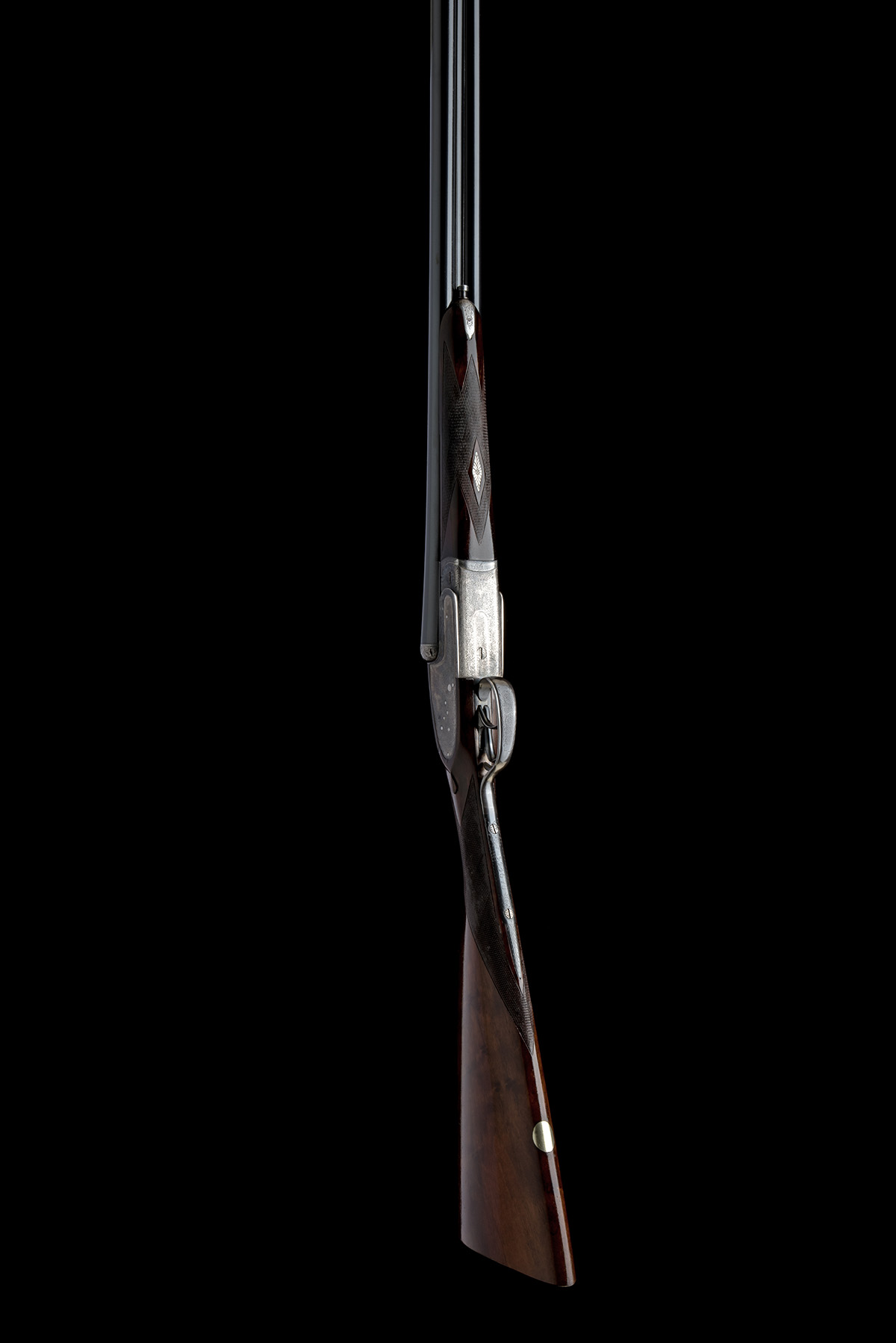 for 1980, 28in. nitro chopperlump barrels, 2 3/4in. chambers, bored approx. true cyl. and 1/4 choke, minor bulging at muzzles, engraved arcaded fences, removable striker discs, automatic safety, hand-detachable lockplates, gold-inlaid cocking-indicators, articulated front trigger, rolled-edge triggerguard, acanthus scroll engraving, retaining some original colour-hardening and finish, 14 1/4in. stock, weight 6lb. 6oz., with a green nylon slip