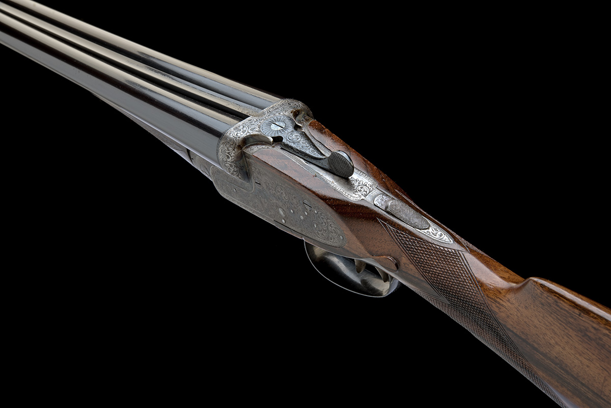 for 1937/8, 26in. nitro barrels, the rib engraved 'CHARLES HELLIS & SONS LTD. 121 & 123 EDGEWARE ROAD. HYDE PARK. LONDON. W.', 2 1/2in. chambers, bored approx. true cyl. and 3/4 choke, automatic safety, cocking-indicators, bold-acanthus scroll engraving with beaded bordering and the makers name in scrolling banners to the lockplates, the top tang, lockplates and triggerguard all swept towards central vision (right shoulder), 15 5/8in. boldly-figured stock including 1in. leather covered recoil pad, weight 6lb. 12oz.