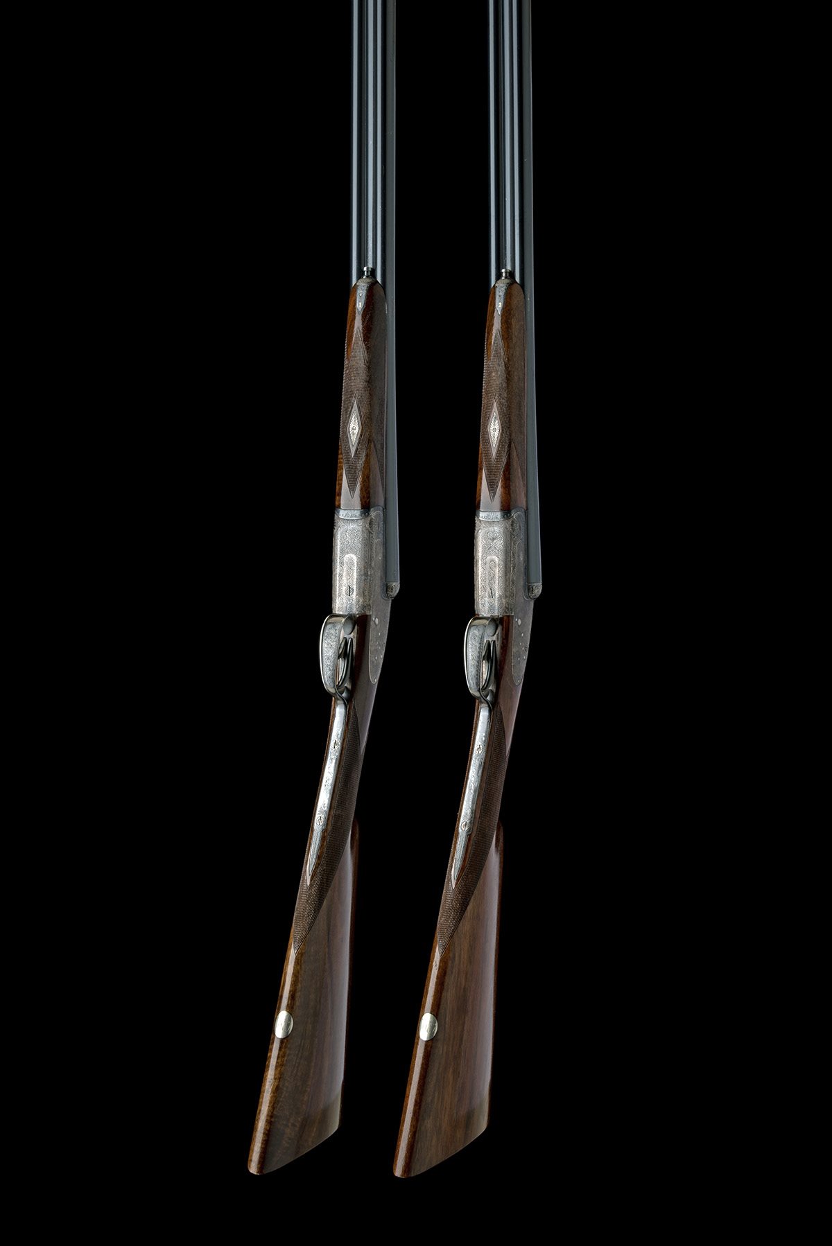 for 2002, 28in. nitro chopperlump barrels, ribs gold-inlaid '1' and '2' at the breech ends, 2 3/4in. chambers, bored approx. 1/4 and 1/2 choke, engraved arcaded fences, removable striker discs, toplevers gold-inlaid '1' and '2', automatic safeties, gold-inlaid cocking-indicators, articulated front triggers, rolled-edge triggerguards, acanthus scroll engraving, retaining some original colour-hardening and finish, 15in. stocks, weight 6lb. 2oz. (No.1) and 6lb. (No.2), in a lightweight leather motor case