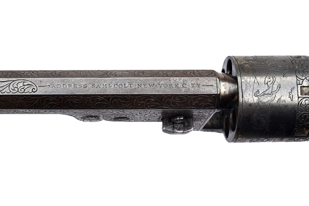 for 1854, the engraving added late 19th century, with octagonal 7 1/2in. barrel signed 'ADDRESS SAML. COLT NEW-YORK CITY', the barrel flats except the underside and address area engraved with coarse scrollwork, open iron frame engraved in a similar manner and marked 'COLTS PATENT', plain six-shot cylinder re-engraved with a scene of buffalo around the front with similar scrollwork to the rear, engraved hammer-sides, engraved brass trigger guard and grip-straps, the back-strap further engraved 'WILLIAM FREMONT', smooth flared walnut grip and engraved under-barrel rammer, all matching numbers (wedge possibly a replacement)