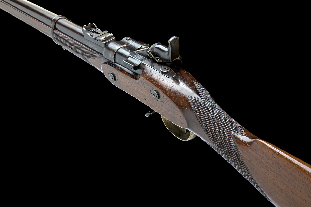 dated for 1865, with 36 1/2in. barrel, block and blade fore-sight, elevating ladder rear-sight, flip-open breech with solid thumb-piece, the top of breech signed 'BSA Co.' and 'SNIDER PATENT', plain lock signed and dated centrally and with 'V.R.' and crown device to tail, walnut full-stock chequered at the wrist and fore-end, brass furniture except for three iron barrel-bands and jag-ended clearing rod