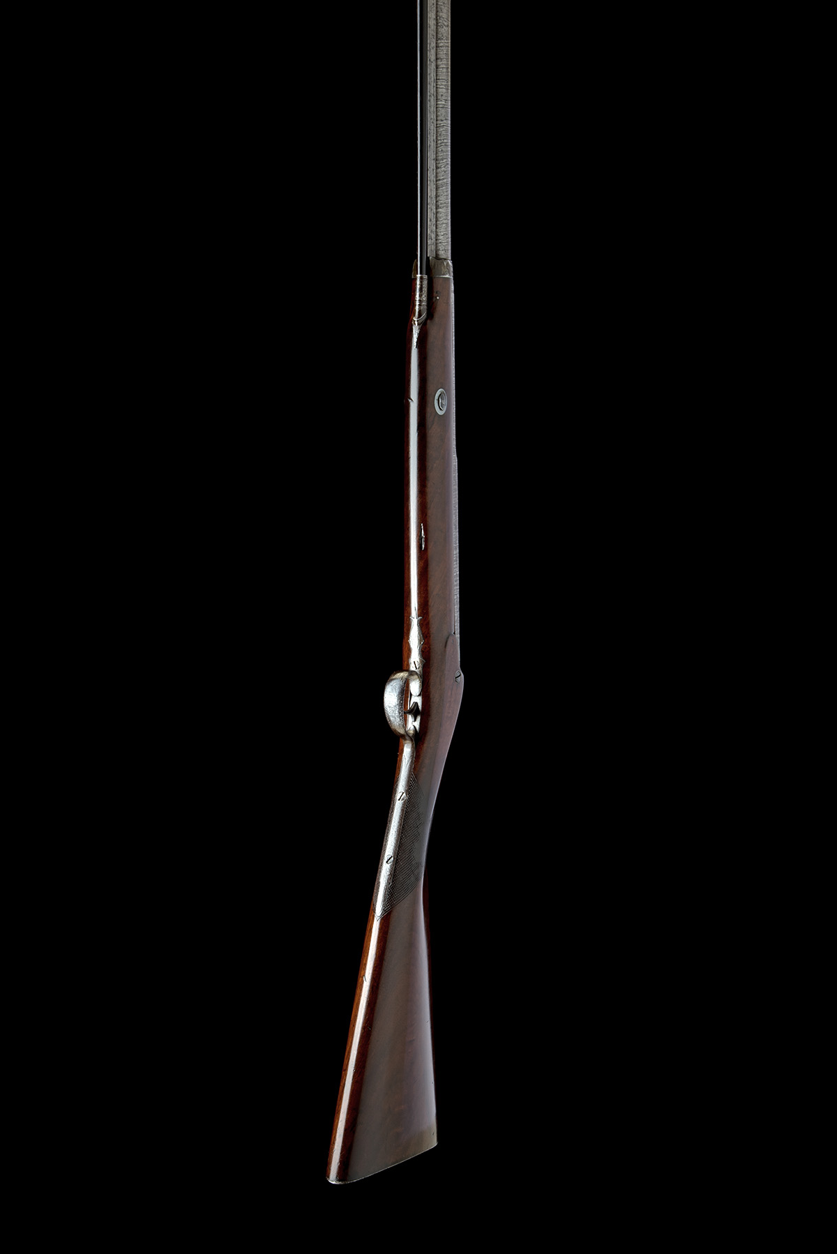 circa 1855, with browned laminated octagonal to sixteen-sided to round 40in. barrel, carved and moulded girdle at the intersection, the top-flat near breech signed 'GOURLAYS GLASGOW', bead fore-sight, sunken sighting groove to the engraved top-tang, engraved breech-block with moulded iron plug, border and gamescene engraved unsigned back-action lock with dolphin headed hammer, walnut half-stock chequered at the wrist, single iron barrel-wedge, white metal fore-end tip and under-barrel ebony ramrod