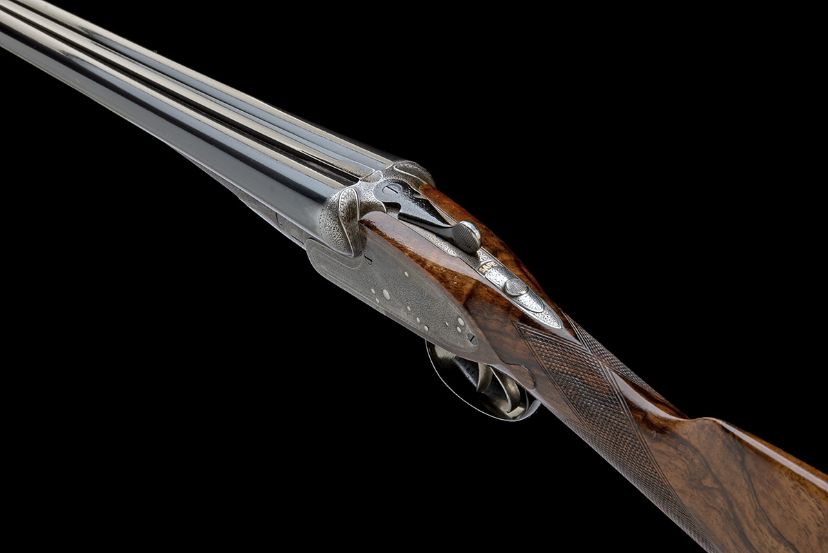 circa 1938, 28in. nitro chopperlump barrels, the tubes engraved 'STEPHEN GRANT & SONS. 7 BURY STREET. ST. JAMES'S. LONDON.', 2 1/2in. chambers, bored approx. true cyl. and imp. cyl. choke, right wall at 19, slender W. Baker patent assisted-opening action, patent no. 16778 of 22nd March 1913, with Baker patent ejectors, fluted fences, removable striker discs, automatic safety with gold-inlaid 'SAFE' detail, fine border and acanthus scroll engraving, retaining traces of colour-hardening and some renewed finish, 15 1/4in. boldly-figured (historic replacement) stock, weight 5lb. 11oz., in a brass-cornered oak and leather case