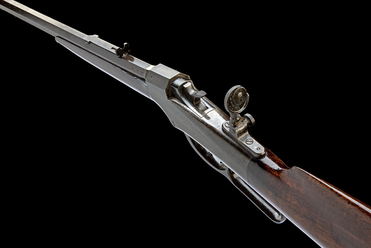 possibly a No.4 Perfection circa 1885, with octagonal 28in. barrel, dove-tailed fore-sight, buckhorn rear-sight, London proofs, semi slab-sided receiver marked 'J.M. MARLIN NEW HAVEN CONN USA' and 'BALLARD'S PATENT NOV 5 1861', falling block breech with external hammer, vernier tang sight, walnut butt-stock with iron semi crescent heel-plate, full finger under-lever opening, double set triggers and walnut splinter fore-end with horn inlay at tip