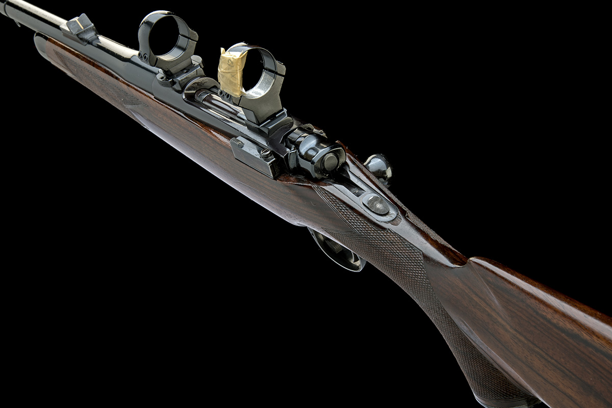 for 1989, 24in. nitro barrel engraved 'GEORGE GIBBS (EST. BRISTOL, 1830) 37, BROAD ST. BATH. ENGLAND', block mounted open sights with matted front, gold-inlaid sightline and marked '100', the plate engraved 'SIGHTED FOR 200 GR BULLET', ramp-mounted bead fore-sight, the receiver mounted with 30mm rings in quickly-detachable mounts, manual tang safety, hinged floorplate engraved 'GEORGE GIBBS .338 WIN. MAG.' and with push button release, well-figured pistolgrip stock with cheekpiece, skeletal steel pistolgrip-cap, sling eyes (front eye missing), rolled-edge triggerguard engraved with the serial number, blued hinged ammunition trap gold monogrammed 'NF' in a circle, 14 1/4in. pull including 5/8in. leather covered recoil pad, weight 8lb. 13oz.