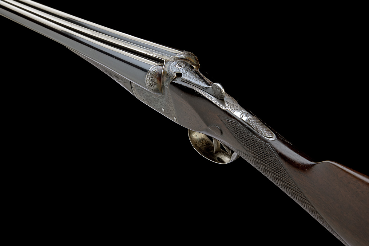 for 1935, 28in. nitro barrels, the rib engraved 'CHARLES BOSWELL. 15. MILL ST. CONDUIT ST. LONDON. W.1.', 2 1/2in. chambers, bored approx. true cyl. and 1/4 choke, automatic safety, border and bold scroll engraving with 'CHARLES BOSWELL' in scrolling banners to the sides, retaining some original colour-hardening, 14in. stock, weight 5lb. 8oz., in its lightweight leather case