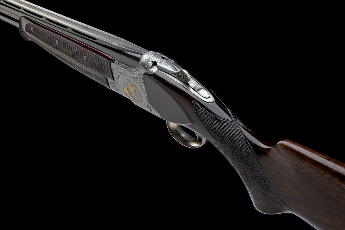 for 1969, 30in. nitro barrels with 16mm ventilated matt top-rib with intermediate bead sight, 2 3/4in. chambers, bored approx. 1/4 and full choke, fore-end decorated to appear a three-piece, hold-open toplever, manual safety with integral barrel selector carved with bold acanthus scroll engraving surrounding gold-inlaid game scenes of pheasant and duck (in B2G style), signed 'BLEUS', 14 3/4in. replacement pistolgrip stock with carved lines and including buttplate, weight 7lb. 8oz.