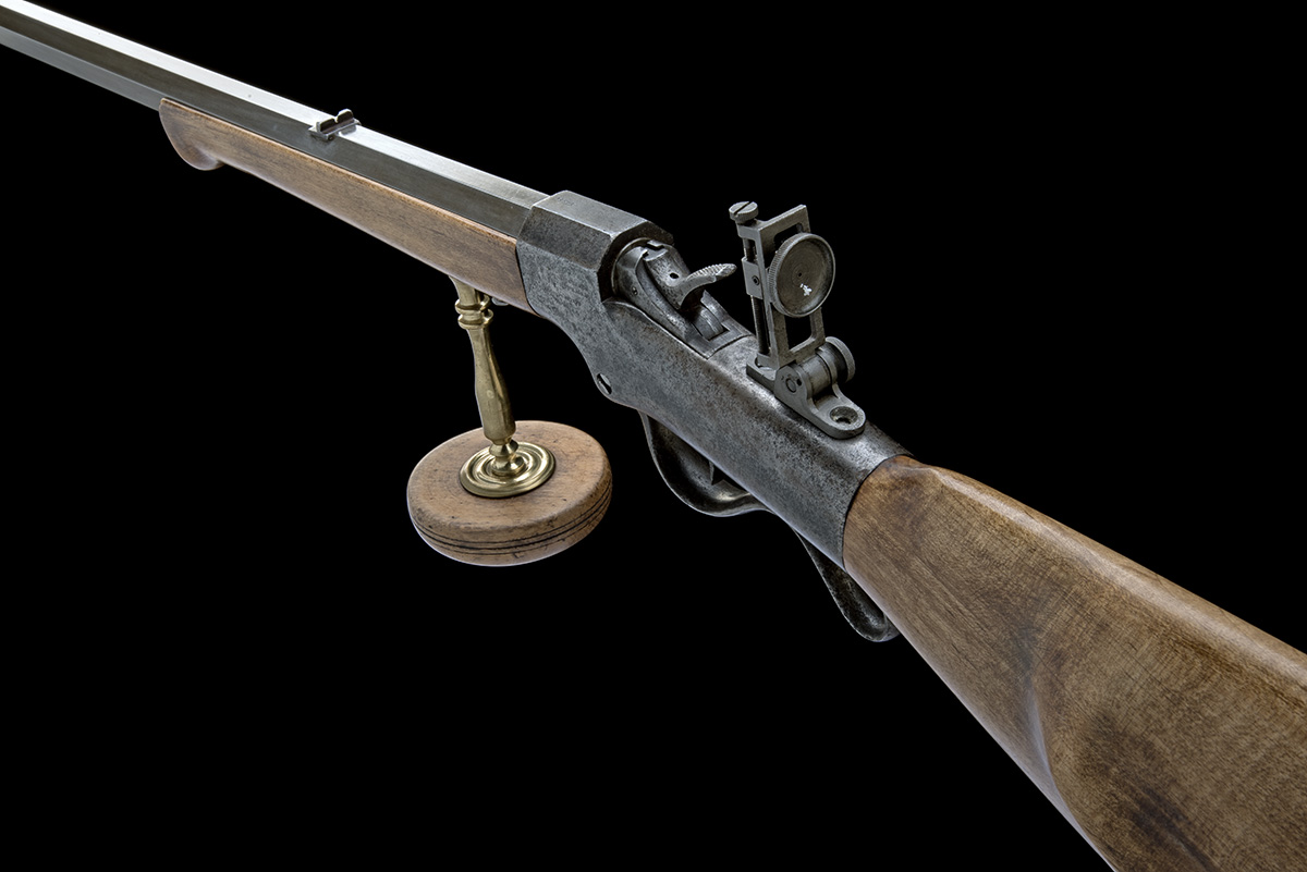 circa 1868, with possible replacement 33 1/4in. octagonal barrel, provision for a dove-tailed fore-sight (sight absent), standing notch rear-sight, rounded falling-block receiver, the breech with dual ignition (percussion parts removed and absent), the left side of receiver marked 'MERRIMACK ARMS & MFG. CO. NEWBURY PORT MASS' over 'BALLARD'S PATENT NOV. 5 1861' (all rubbed), central hammer, the top-tang later fitted with a folding peep-sight, restocked in the Swiss schuetzen style and fitted with a mushroom-headed palm-rest