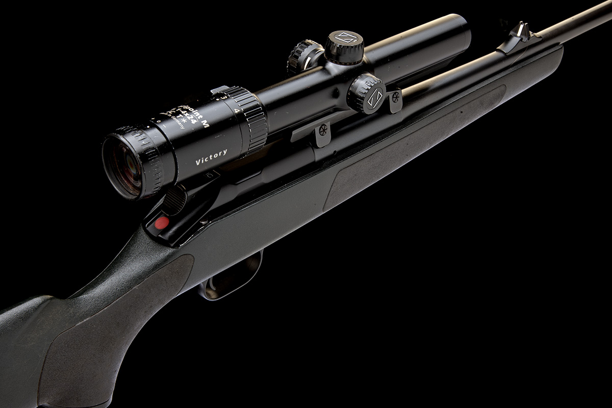 for 2008, 24 3/4in. ported nitro barrel with ramp-mounted open sights and ramp-mounted bead fore-sight, the breech end fitted with a Zeiss Varipoint M 1,1-4x24 iC T* Victory telescopic sight, serial no. 3333462, on a Blaser quickly-detachable rail mount, dark green synthetic stock with black rubber grip panels, left hand palm swell, sling eyes, 14 3/8in. pull including 1/2in. rubber recoil pad, weight 7lb. 10oz. (unscoped) and 9lb. 2oz. (with scope), in its makers take-down abs case
