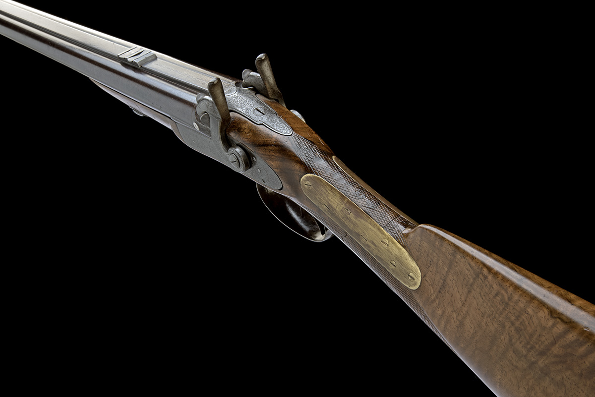 for 1863, with laminated 29 3/4in. barrels, the right in smooth 14-bore, the left a 20-bore rifle, broad flat top-rib signed 'E.M. REILLY & CO, 302 NEW OXFORD STREET LONDON' (rubbed), dove-tailed fore-sight, rear-sight with folding battue leaf sight and folding 500yd. leaf, scroll engraving to rib-end and fully engraved top-tang, border and scroll engraved bar-action locks signed 'E.M. REILLY & CO.', scroll engraved dolphin headed hammers, walnut half-stock chequered at the wrist and fitted with well executed brass repair plates, iron furniture and brass mounted heavy duty ramrod with worm tip
