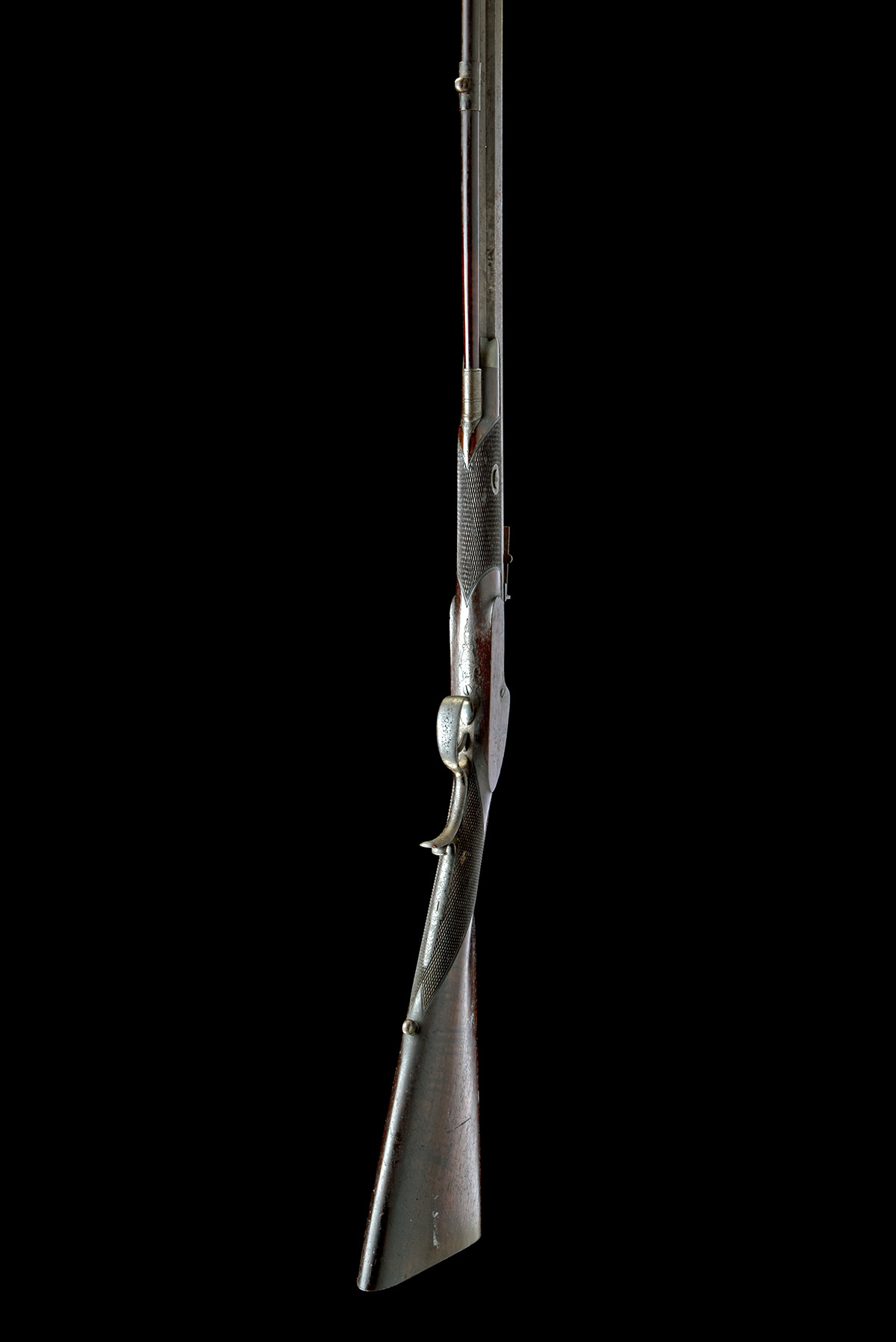 circa 1860, with octagonal 30in. barrel rifled in three grooves and fitted with a raised flat top-rib signed 'TIPPING & LAWDEN, HOLBORN, LONDON', dove-tailed fore-sight, elevating ladder rear-sight, colour hardened scroll engraved squared breech, colour hardened scroll engraved top-tang, bar-action colour hardened lock with scroll engraving and bolted safe (hammer absent, square intact), chequered walnut half-stock with iron furniture including patch-box, chequered and raised lower tang, single set trigger, eyelets for sling and heavy duty brass mounted mahogany ramrod, the whole with strong traces of finish below surface corrosion