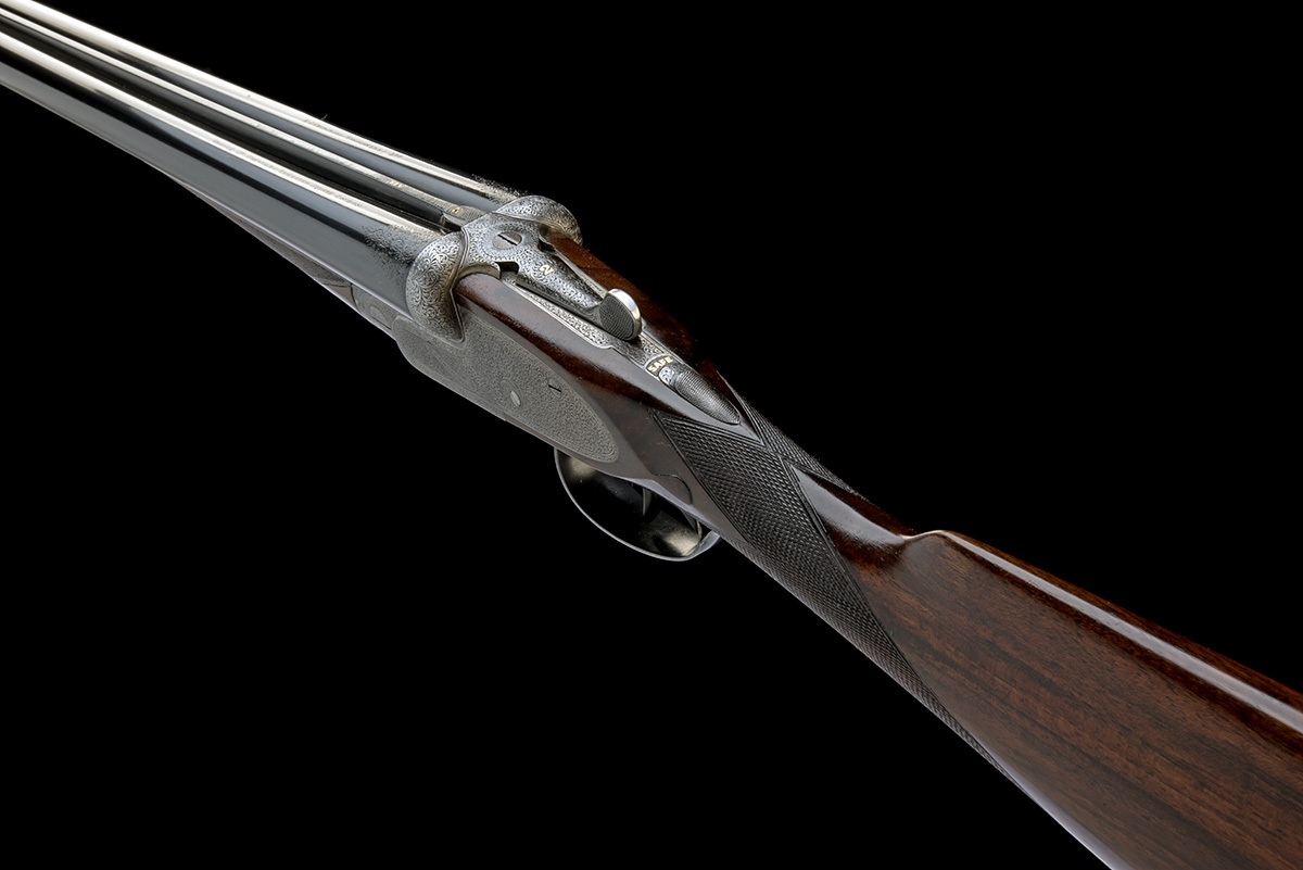 for 1934, 25in. nitro barrels, matt Churchill-rib gold-inlaid 'XXV' and '2' at the breech end, the tubes engraved 'E. J. CHURCHILL (GUNMAKERS) LTD. ORANGE ST. GUNWORKS. LEICESTER SQUARE. LONDON.' and with acanthus scroll detailing at the breech ends, 2 1/2in. chambers, bored approx. imp. cyl. and 1/4 choke, wall thicknesses at 17 and 16, slender fences, toplever gold-inlaid '2', automatic safety with gold-inlaid 'SAFE' detail, gold-inlaid cocking-indicators, double rolled-edge triggerguard, fully engraved with fine acanthus scrollwork, the lockplates with 'E. J. CHURCHILL' in scrolling banners, the underside gold-inlaid 'THE PREMIERE QUALITY', 14 3/8in. figured stock, weight 6lb. 4oz., in a lightweight leather case