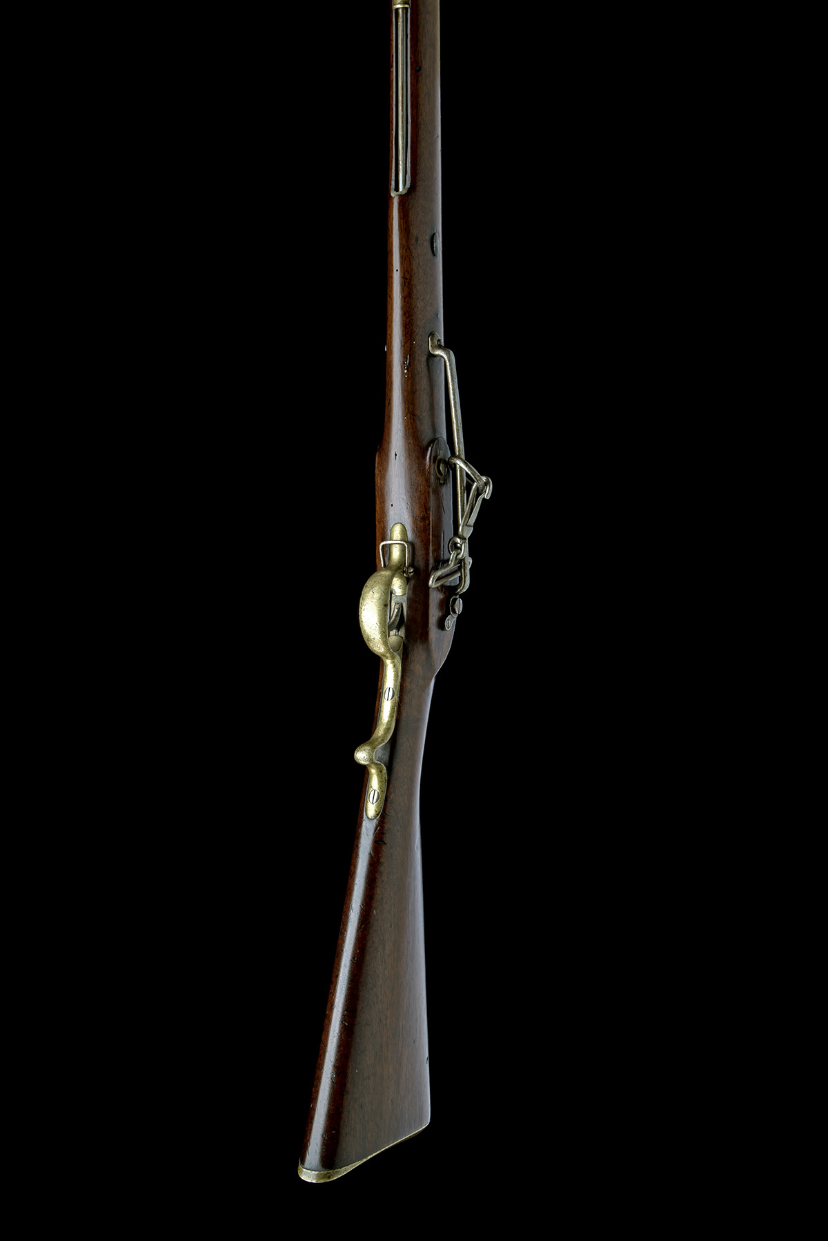 dated for 1844, with round smoothbore laminated 20in. barrel, applied blade fore-sight, fixed standing notch rear-sight, the breech also stamped 'ENFIELD 1844' together with an assortment of inspector's marks, solid top-tang with rounded tip, borderline engraved lock signed 'TOWER 1844' below a 'V.R.' crown device (rubbed), borderline engraved hammer with chequered spur, walnut full-stock with stocker's stamp 'J. RICHARDSON' behind the iron saddle-bar, brass furniture and captive iron ramrod