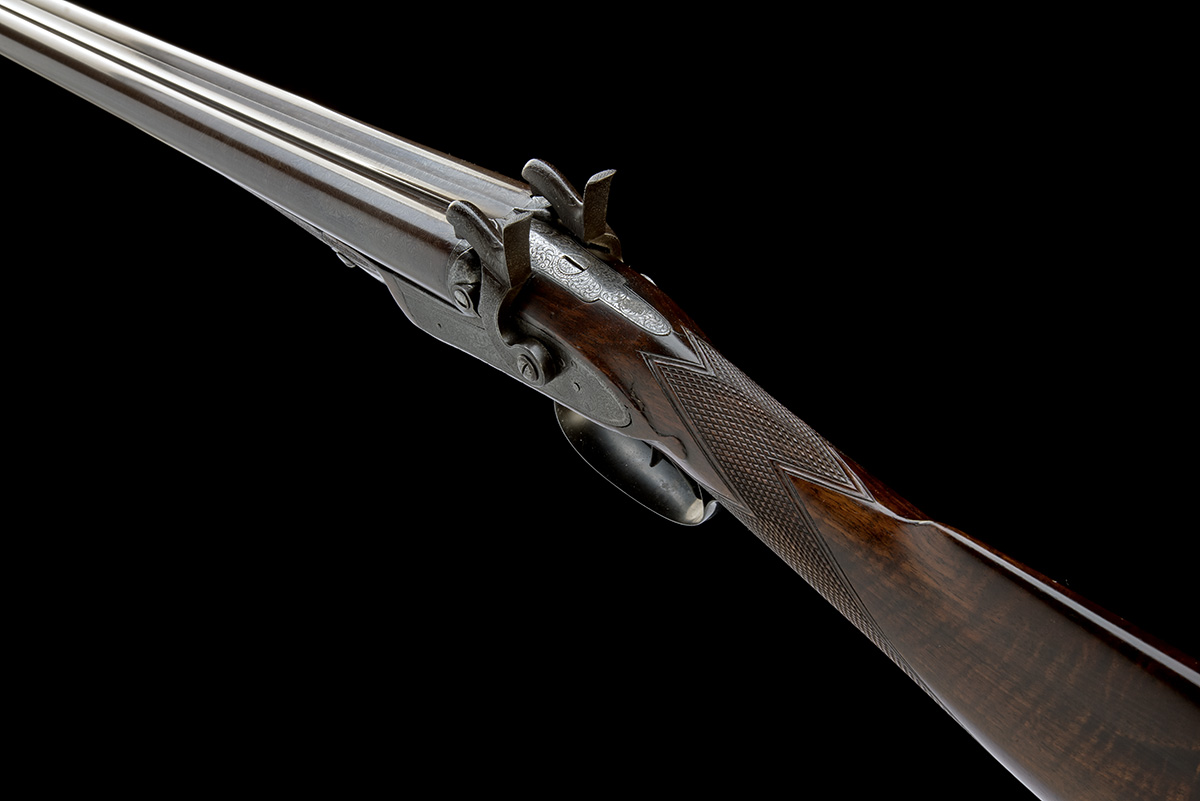 built on the 1862 patent with use number '28', with 29 3/4in. browned barrels marked 'DAMASCUS' to the underside and signed on the top-rib 'JOSEPH NEEDHAM PATENT 26 PICCADILLY LONDON', engraved starbursts around the pin apertures, border and scroll engraved action, border scroll and gamescene engraved bar-action locks, short side-lever to the right side opening the gun and placing the hammers on half-cock, chequered walnut butt-stock (cracked and repaired at wrist), iron furniture, chequered walnut splinter fore-end, in a period leather covered two-tier oak casing lined and compartmented in green baize, lift out tray for the stock and action, the lower tray for the barrels and ammunition