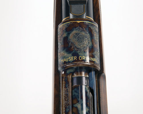 23 3/8in. nitro barrel gold-inlaid 'WAFFEN JUNG. LOHMAR' and with two gold lines at the breech, with finely matted and gold-highlighted sight rib, gold-inlaid with the calibre designation and with gold-inlaid open sights and two folding leaf sights for 50, 100 and 150 metres, finely matted and gold highlighted ramp-mounted bead fore-sight with flip-up moonsight, the receiver mounted with a Zeiss Diavari 2,5-10x50 T* telescopic sight in quickly-detachable mounts, receiver ring gold-inlaid 'MAUSER ORIGINAL', side wall (with thumb cutout) engraved 'WAFFENFABRIK MAUSER-OBERNDORF A/N MODELO 1909', floral engraved and gold highlighted recoil block, detachable floorplate with rotary release lever, bolt handle with progressive radial cut chequering, the receiver, bolt and furniture with fine acanthus scroll engraving, gold detailing and retaining virtually full colour-hardened finish, highly-figured pistolgrip stock with cheekpiece, horn finial, engraved and colour-hardened steel pistolgrip-cap, sling eyes, 14 3/8in. pull including 1/2in. rubber recoil pad