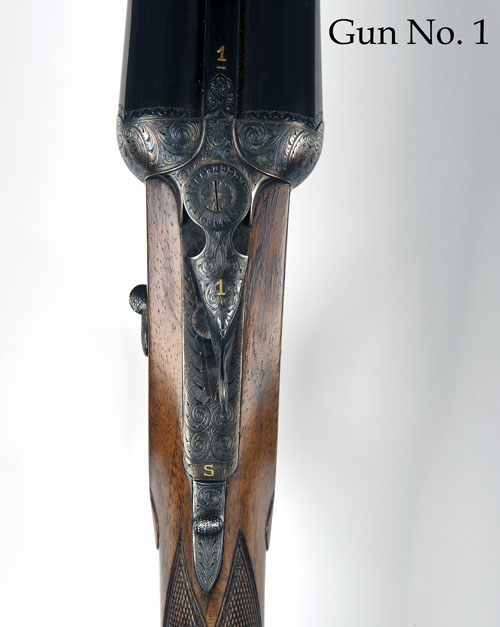 28in. nitro chopperlump barrels, ribs gold-inlaid '1' and '2', 2 3/4in. chambers, bored approx. full and 1/2 choke (No.1) and 1/2 and full choke (No.2);