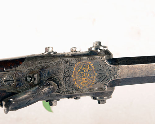 Belgian, circa 1840, with 29 1/4in. browned twist sighted barrel rifled with seven grooves and with silver and gold-inlaid signature 'A.M. LESOINNE & PIRLOT FILS A LIEGE', colour-hardened breech engraved with a sunburst and foliage and with gold-inlaid initials 'FH', the barrel pivoting at the breech on a hinge-pin with exposed trunnions, colour-hardened action engraved with foliage and a bold running border with a further five exposed trunnions and two pierced platinum-lined vents, adjustable rear-sight, the underside with barrel-release catch, colour-hardened detented back-action lock decorated en suite, burr-walnut stock with raised shaped cheek-piece and chequered double-grip, single-set trigger, blued butt-plate and scrolled trigger-guard engraved en suite with the action, iron sling eyes, the whole in fine order and retaining much original finish throughout.