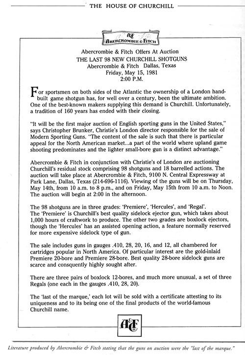 Provenance: In the early 1980's, when Churchill's ceased trading, a decision was made to sell the remaining new guns in a special auction, to be held in conjuction with Abercrombie & Fitch, the Harris & Sheldon Group Ltd. and Christie, Manson & Woods International, at Abercrombie & Fitch's premises in Dallas, Texas.
