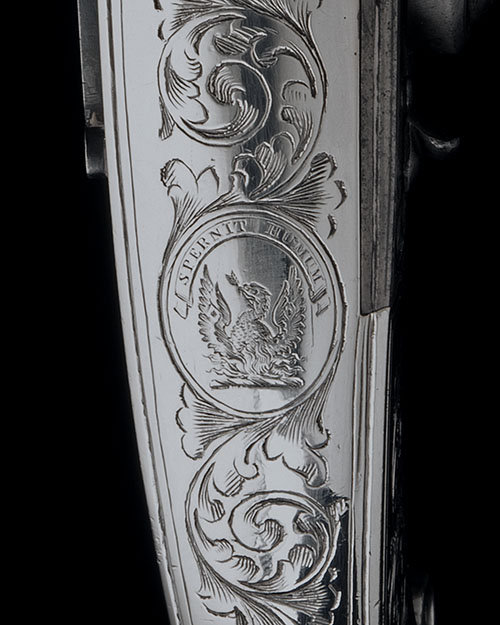 circa 1880, with triple staged 5in. barrel, the muzzle and breech faceted and engraved en-suite, fenced nipple, scroll engraved lock signed 'WIGHTON EDINBURGH' (traces of colour), scroll engraved hammer with sliding safe behind, borderline and scroll engraved solid silver 'ramshorn' butt, the back-strap engraved with a crest within an oval inscribed ''SPERNIT HUMUM' above a phoenix with an arrow in its beak, central screw-out pricker with turned 'thistle' head, small belt-hook to left hand side, ball trigger and turned iron ramrod