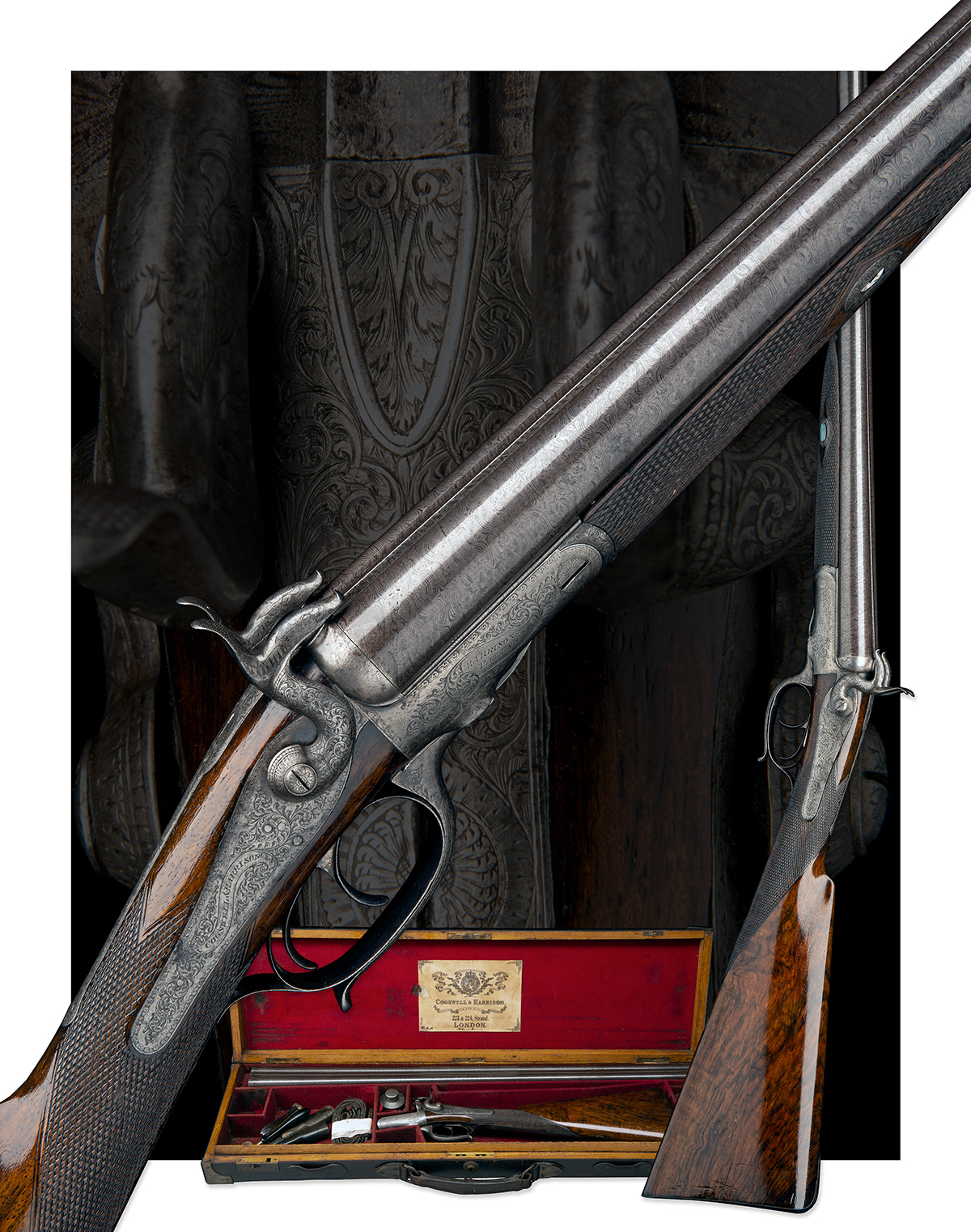 circa 1865, with fine brown damascus 30in. barrels, the top-rib signed 'COGSWELL & HARRISON 223 & 224 STRAND, LONDON', bead fore-sight, carved bosses behind the pin apertures with rising rods operating off the under-lever pushing the hammers back to half-cock, border and scroll engraved back-action locks signed in banners 'COGSWELL & HARRISON', scroll engraved dolphin-headed hammers, walnut butt-stock chequered at the wrist, iron heel-plate, push-forward underlever with exposed spring in the lower action body, the scroll engraved action also marked within a banner 'HARRISON'S PATENT' and walnut chequered splinter fore-end with cross key fastener, together with a period leather-covered oak storage case lined in red baize, reproduction trade label inside lid and complete with two turnscrews, two sizers, a pewter oil bottle, a measure and sundry cleaning equipment