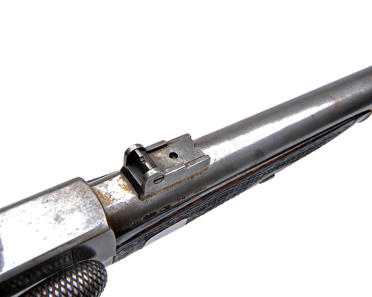 circa 1860 and possibly for trials, with round tapering 17 1/2in. barrel, block and blade fore-sight, swivelling leaf rear-sight, shaped receiver with swing out reverse loading breech-block operating on an articulated chequered bolt, plain banana-shaped back-action lock, the side hammer with integral safety locking bolt, full chequered pistol-grip butt-stock with a number '9' stamped on left hand side near heel (small chip at toe), iron furniture, chequered walnut splinter fore-end, London proofs, mostly cleaned of finish