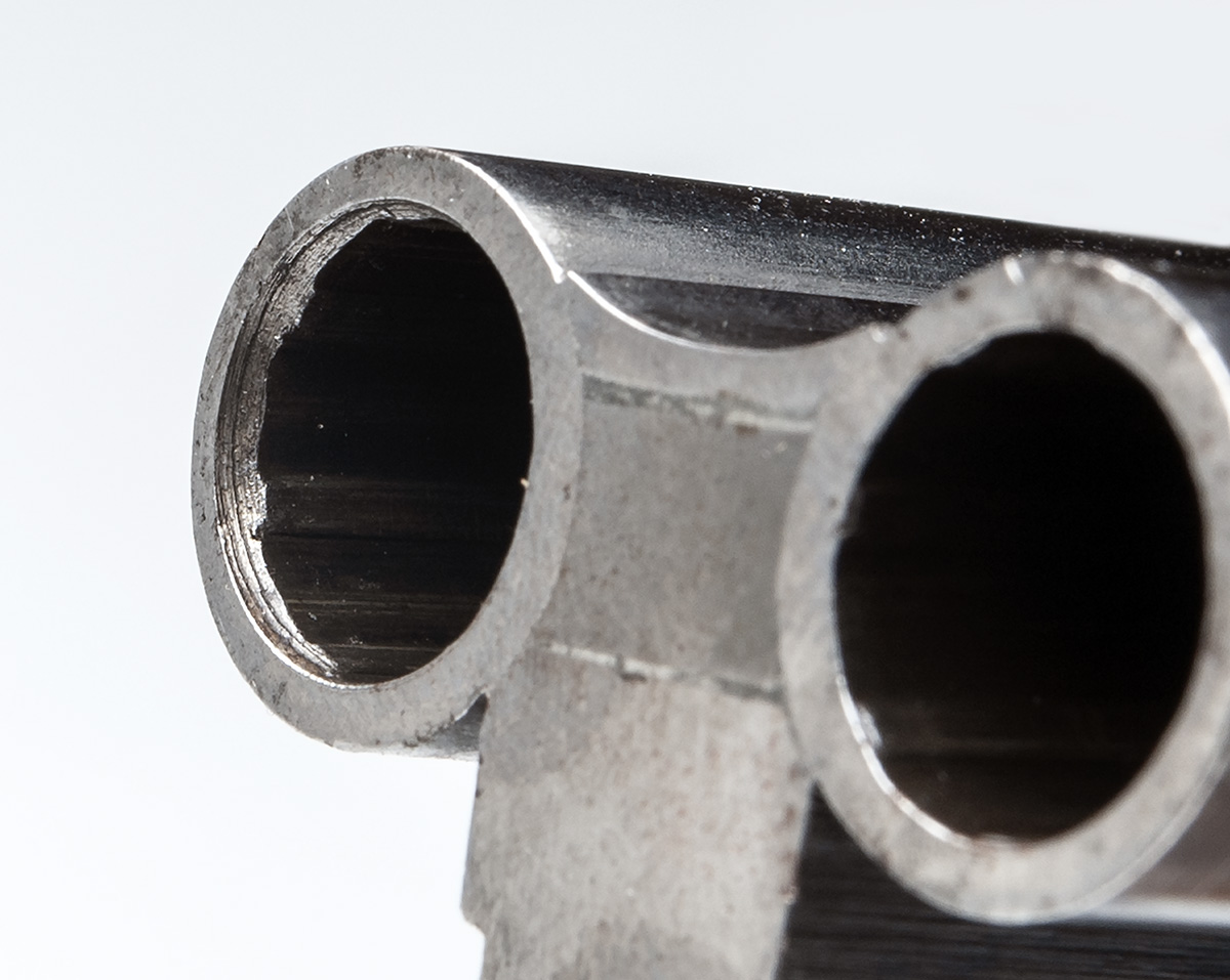 25 1/2in. nitro barrels with matt sight rib, open sights and two folding leaf sights, ramp-mounted bead fore-sight, muzzle partly recrowned, treble-grip action, elongated top strap with manual safety, border engraving, retaining much colour-hardening and finish, 15in. figured pistolgrip stock with cheekpiece, sling swivels and including 1 1/8in. rubber recoil pad, weight 9lb. 14oz.