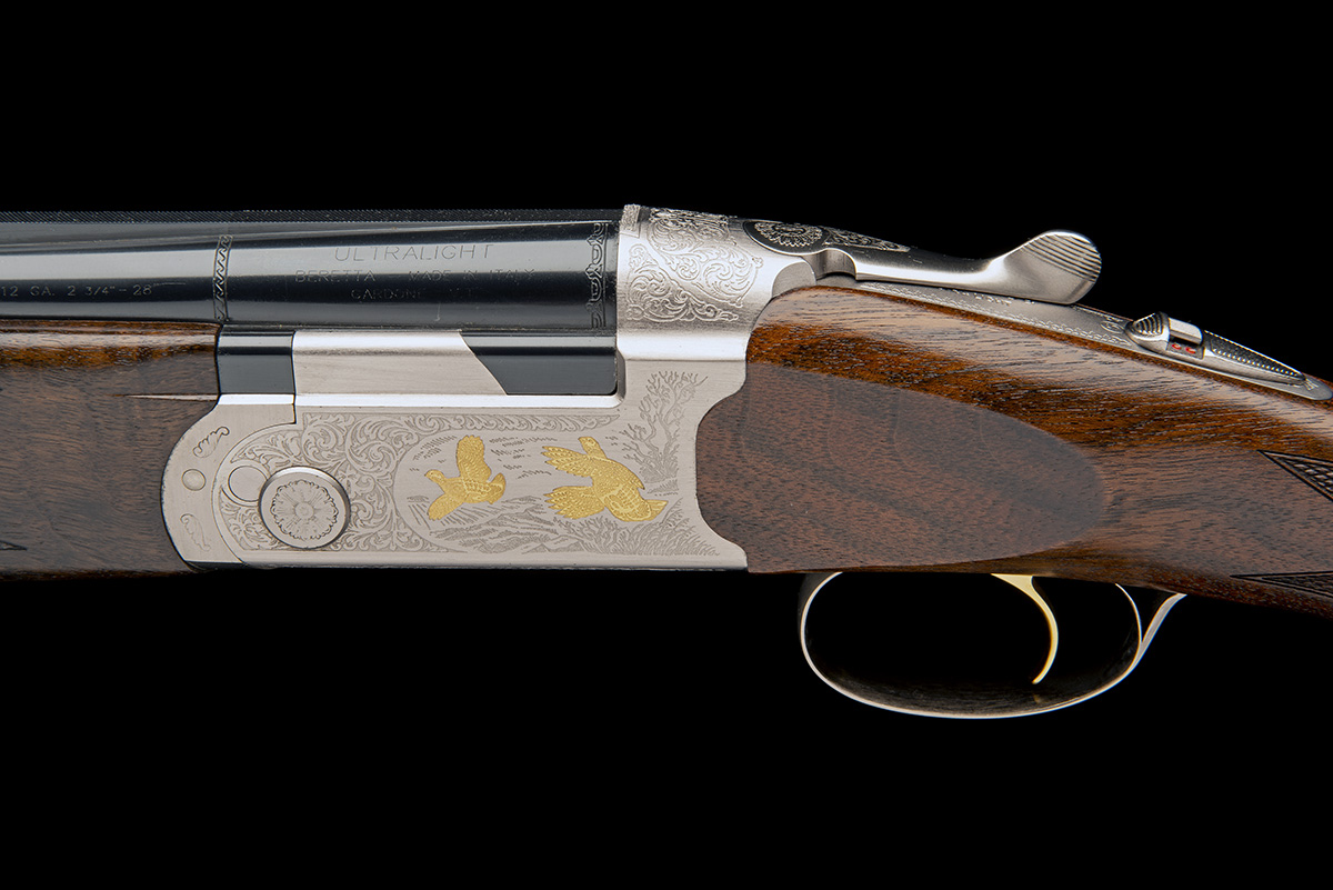 28in. nitro barrels with 5mm ventilated matt top-rib, 2 3/4in. chambers, multichokes (with spares), hold-open toplever, automatic safety with integral barrel selector switch, gold-washed single trigger, scroll engraving with gold detailed game scenes, 14 1/2in. pistolgrip stock including 3/8in. rubber recoil pad, weight 6lb. 4oz., in its universal case