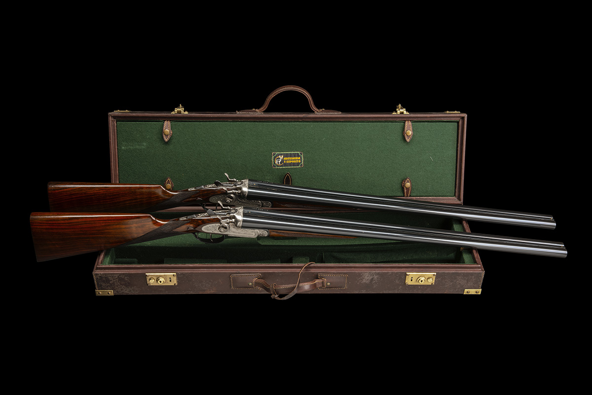 28in. nitro chopperlump barrels, ribs gold-inlaid '1' and '2' at the breech ends, 2 3/4in. chambers, bored approx. 1/2 and full choke, toplevers gold-inlaid '1' and '2', tang mounted automatic safeties, smooth serpentine fences, rebounding sidelocks with scrolled hammers, scroll engraving, bright and blued finish overall, 14 3/8in. figured stocks, weight 6lb. 14oz., in a brass-cornered leather motor case