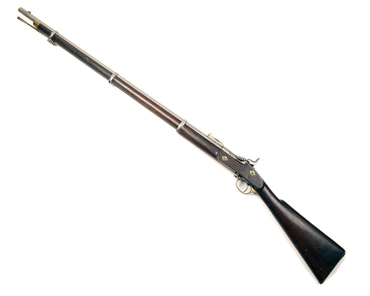 dated for 1871, with brushed bright 36 1/2in. barrel, block and blade fore-sight, elevating ladder rear-sight, flip open breech with sprung locking catch, signed lock marked with a 'V.R'. and crown device, walnut three-quarter stock, brass furniture except three-iron barrel bands and iron clearing rod, the whole cleaned of finish and in the white