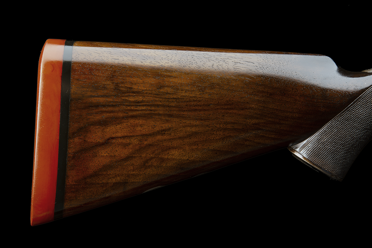 38 1/4in. black powder only fine damascus barrels, the rib engraved and gold-inlaid in black type 'R. B. RODDA & CO. GUNMAKERS LONDON' and with '3' at the breech end, the tubes engraved and gold-inlaid in black type '7 & 8 Dalhousie Square Calcutta' and 'H R H The Maharajah of Jaipur', the breech ends profusely engraved with acanthus scrollwork, ivory bead fore-sight, Jones patent rotary underlever, carved percussion fences, rebounding back-action locks, fine border and acanthus scroll engraving, retaining much renewed colour-hardening overall, 14 1/4in. pistolgrip stock with engraved and colour-hardened steel pistolgrip-cap, two oval escutcheons (one engraved '3') and including 1in. rubber recoil pad, fore-end with grip-catch release lever, weight 19lb. 4oz., in a new brass-cornered oak and leather case with canvas and leather outer, the interior lined in blue baize, the lid with Rodda trade label, internal protector flap with Holland & Holland trade label