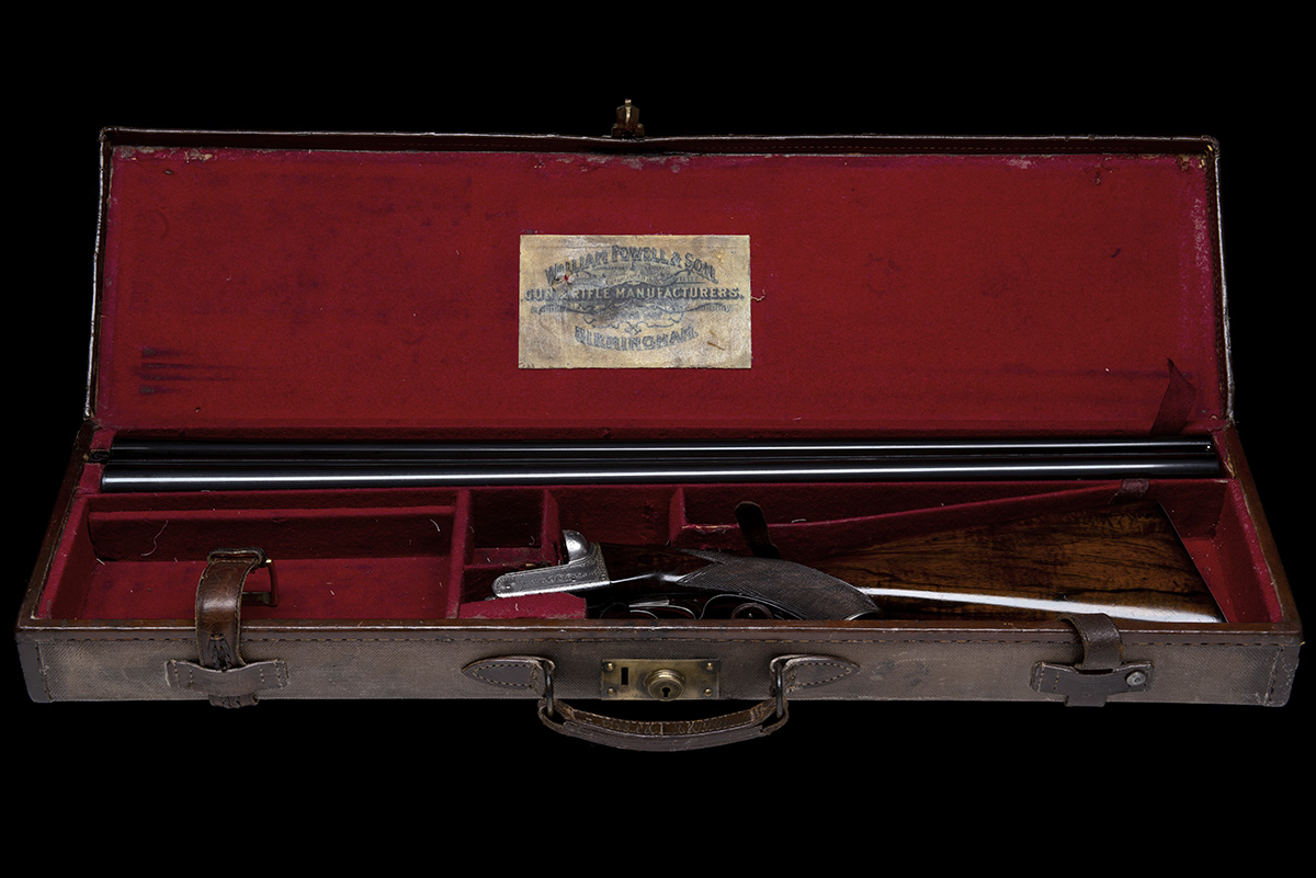 30in. nitro reproved barrels (some movement on action), the rib engraved 'WILLIAM POWELL & SON. 13 CARR'S LANE. BIRMINGHAM. PATENT.', 3 1/2in. chambers, bored approx. true cyl. in both, Anson & Deeley 1875 patent barrel cocking action, patent no. 1756, use no. 2280, incorporating William Powell patent lift-up toplever, patent no. 1163 of 7th May 1864, use number 2300, automatic safety with gold-inlaid 'SAFE' detail, carved percussion fences, fine border and acanthus scroll engraving, brushed bright and re-blued finish overall, 14in. figured pistolgrip stock (pinned at head) including steel buttplate and steel pistolgrip cap, fore-end with Deeley & Edge patent release catch, weight 8lb. 14oz., in a canvas and leather hammergun case