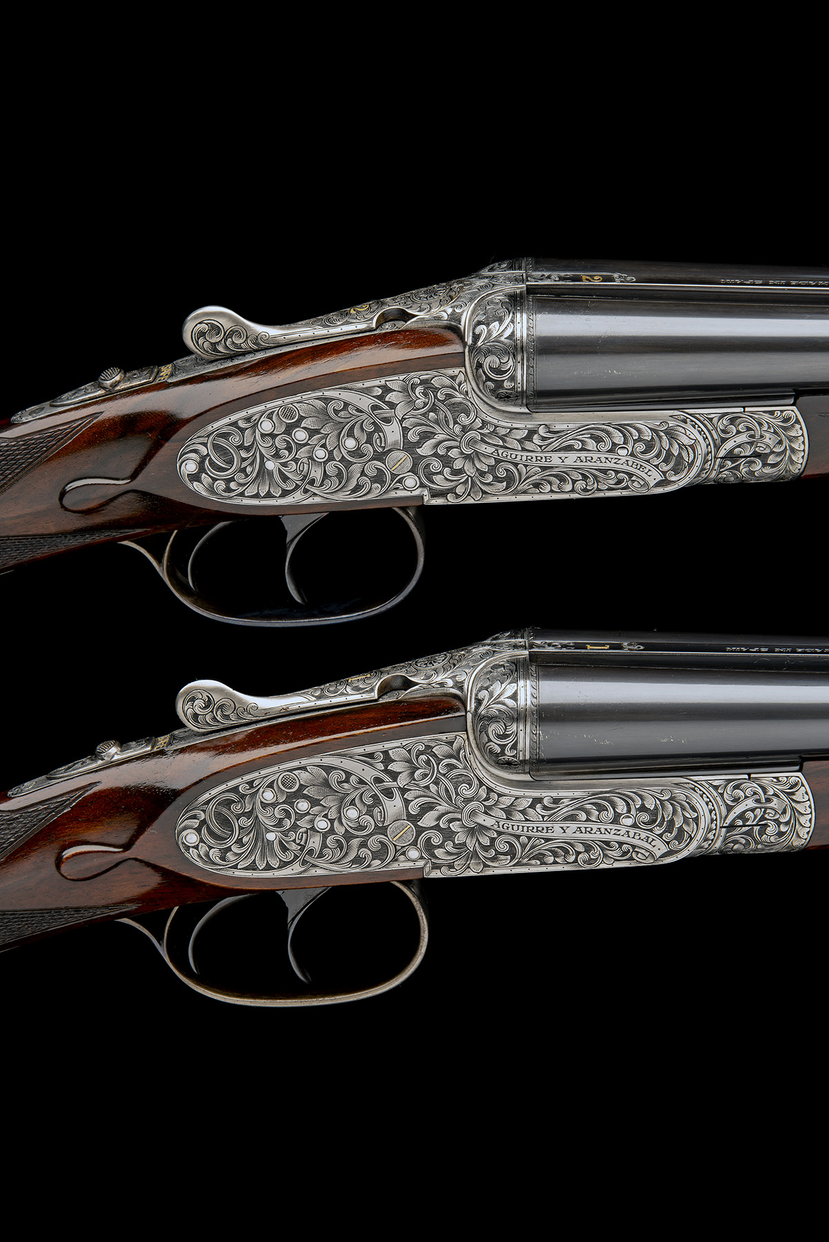 26 1/2in. nitro chopperlump barrels, the ribs gold-inlaid '1' and '2', and engraved 'AYA - AGUIRRE & ARANZABAL - MADE IN SPAIN', 2 3/4in. chambers, bored approx. 1/4 and 1/2 choke (both), toplevers gold-inlaid '1' and '2', automatic safeties with gold-inlaid 'SAFE' details, hand-detachable lockplates, gold-inlaid cocking-indicators, articulated front triggers, rolled-edge triggerguards, engraved with bold foliate acanthus scrollwork set against a matt background, the triggerplates signed 'G. Moore.', bright finishes, the triggerplates colour-hardened, 15in. figured stocks, weight 5lb. 3oz., in a leather double motorcase with canvas outer