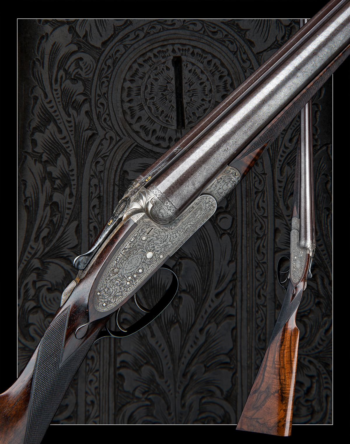 30in. damascus nitro barrels, the rib engraved 'WILKINSON. 27 & 28 PALL MALL. LONDON. S.W.', and gold-inlaid '2' at the breech end, 2 1/2in. chambers, bored approx. true cyl. and full choke, some pitting and dents, treble-grip action with removable striker discs, carved stylised leaf fences, slender toplever gold-inlaid '2', automatic safety with gold-inlaid 'SAFE' detail, the action, lockplates and furniture profusely engraved with fine scrolling acanthus and foliate designs on a matted background, retaining traces of original colour-hardening, 14in. well-figured stock (some grain separation at hand), weight 6lb. 10oz.