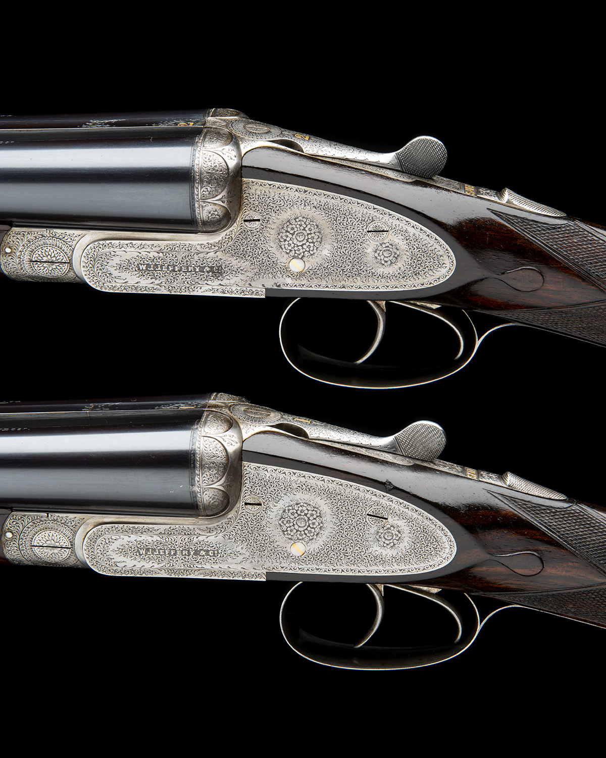 28in. replacement nitro barrels, the ribs gold-inlaid '1' and '2' at the breech ends, the tubes engraved 'W. J. JEFFERY & CO. LTD. 13, BRUTON STREET. LONDON.', 2 3/4in. chambers, bored approx. 1/2 and full choke, treble-grip actions with hidden third bites, carved arcaded fences, toplevers gold-inlaid '1' and '2', automatic safeties with gold-inlaid 'SAFE' details, fine acanthus scroll engraving with floral bouquets, brushed finish overall, 14 5/8in. highly-figured stocks including 1in. rubber recoil pads, weight 6lb. 11oz., in their brass-cornered oak and leather case with internal protecting flap